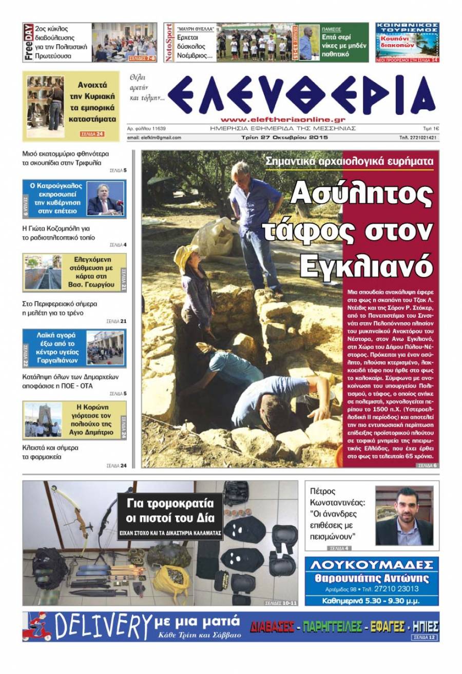 Το πρωτοσέλιδο της "Ελευθερίας" - Τρίτη 27 Οκτωβρίου 2015 Για να κατεβάσετε το αρχείο πατήστε πάνω στο κουμπί που γράφει download pdf