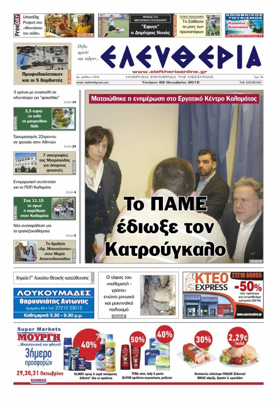 Το πρωτοσέλιδο της "Ελευθερίας" - Τετάρτη 28 Οκτωβρίου 2015 Για να κατεβάσετε το αρχείο πατήστε πάνω στο κουμπί που γράφει download pdf