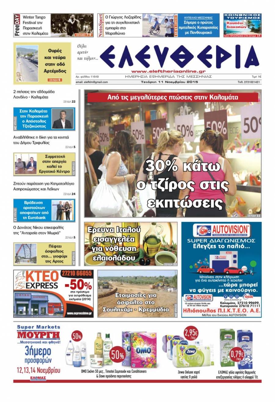 Το πρωτοσέλιδο της "Ελευθερίας" - Τετάρτη 11 Νοεμβρίου 2015 Για να κατεβάσετε το αρχείο πατήστε πάνω στο κουμπί που γράφει download pdf