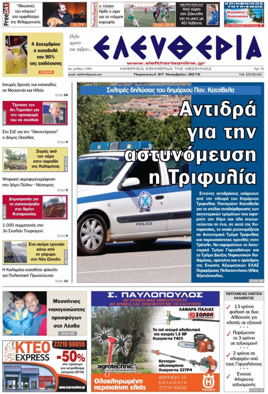 Το πρωτοσέλιδο της "Ελευθερίας" - Παρασκευή 27 Νοεμβρίου 2015 Για να κατεβάσετε το αρχείο πατήστε πάνω στο κουμπί που γράφει download pdf