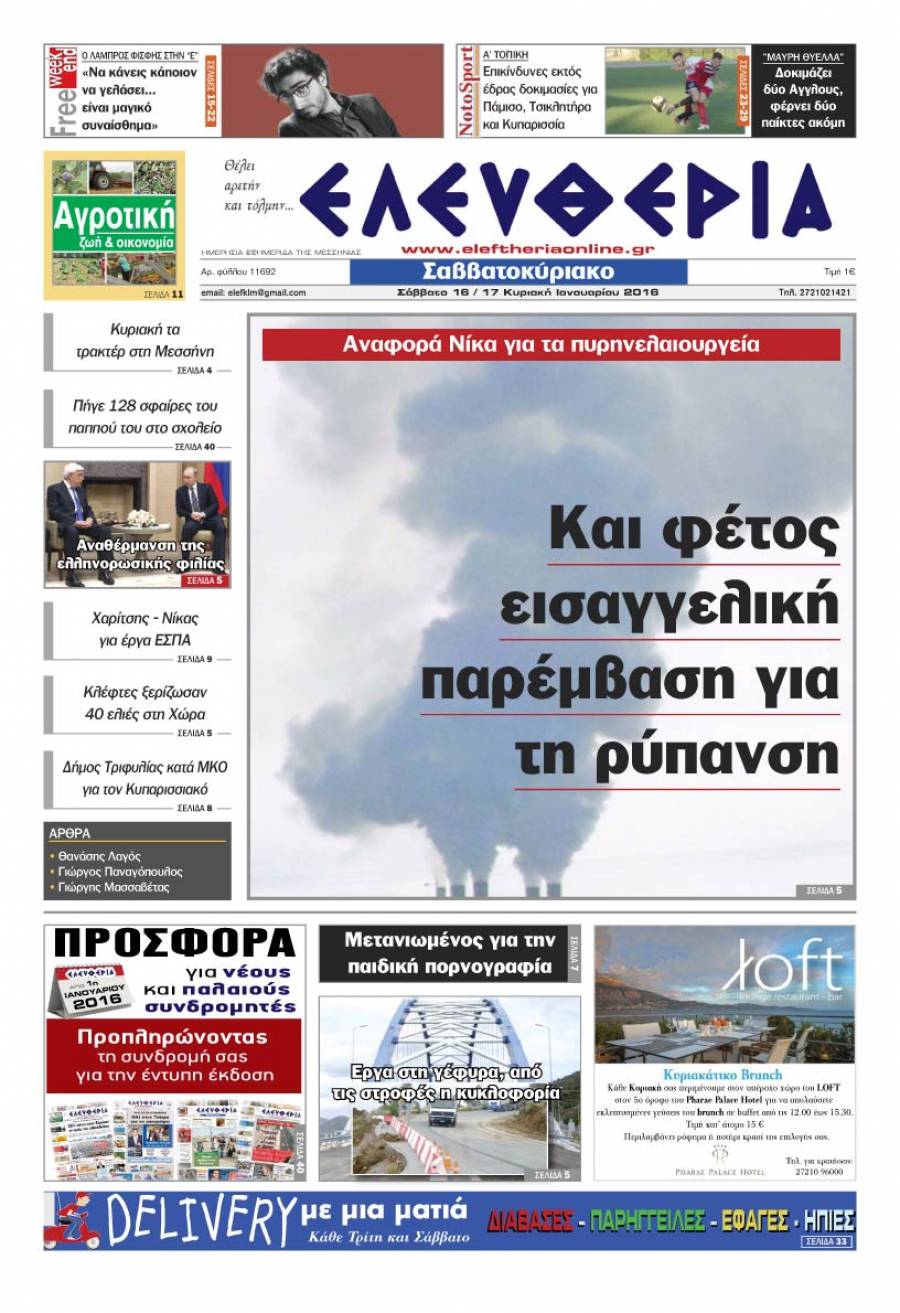 Το πρωτοσέλιδο της "Ελευθερίας" Σαββατοκύριακο 16-17 Ιανουαρίου 2016