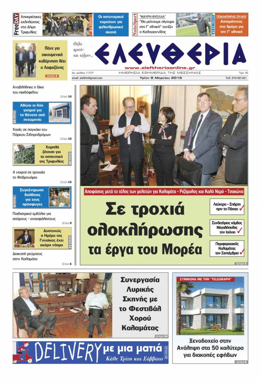Το πρωτοσέλιδο της "Ελευθερίας" - Τρίτη 8 Μαρτίου 2016 Για να κατεβάσετε το αρχείο πατήστε πάνω στο κουμπί που γράφει download pdf
