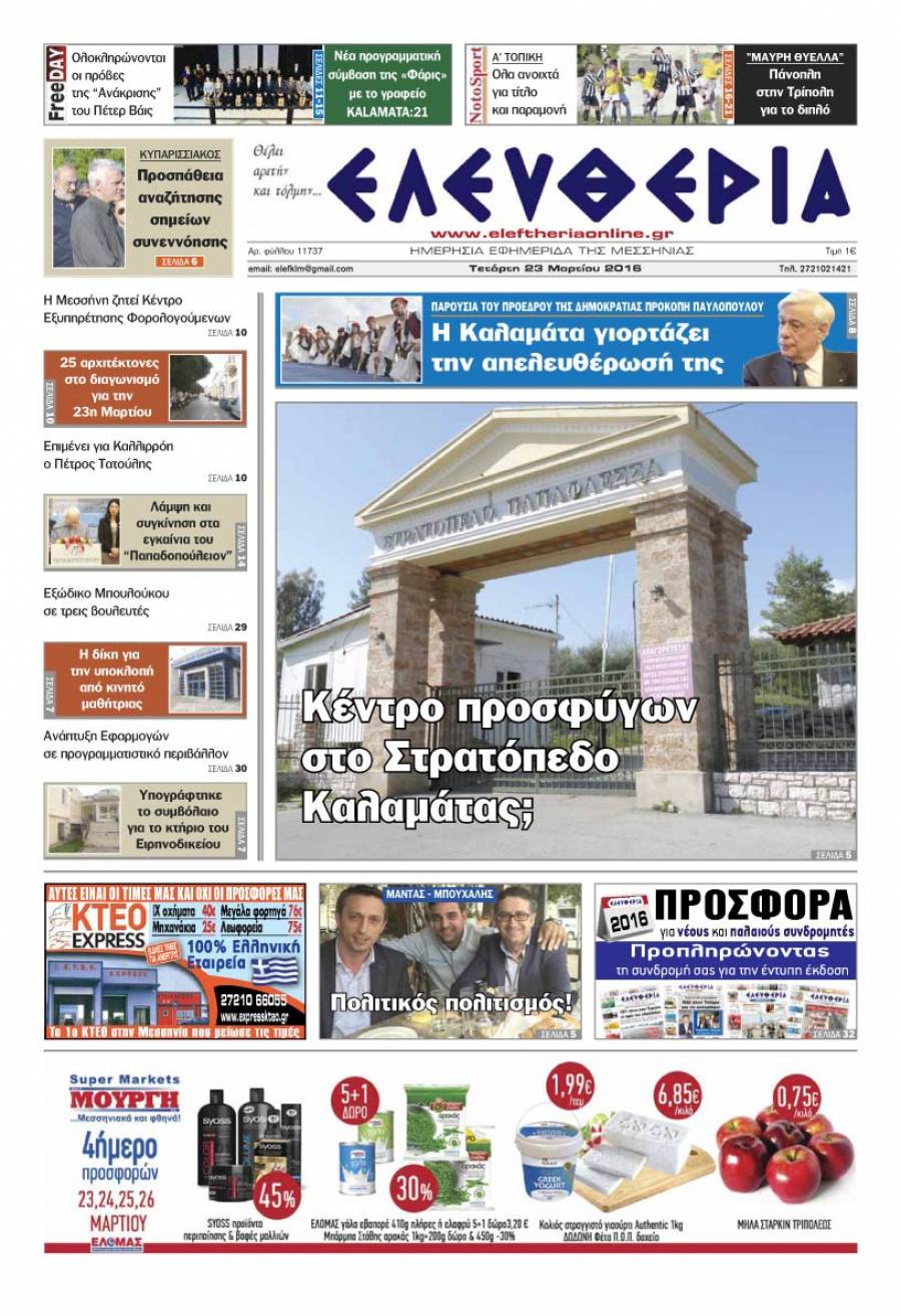 Το πρωτοσέλιδο της "Ελευθερίας" -Τετάρτη 23 Μαρτίου 2016 Για να κατεβάσετε το αρχείο πατήστε πάνω στο κουμπί που γράφει download pdf