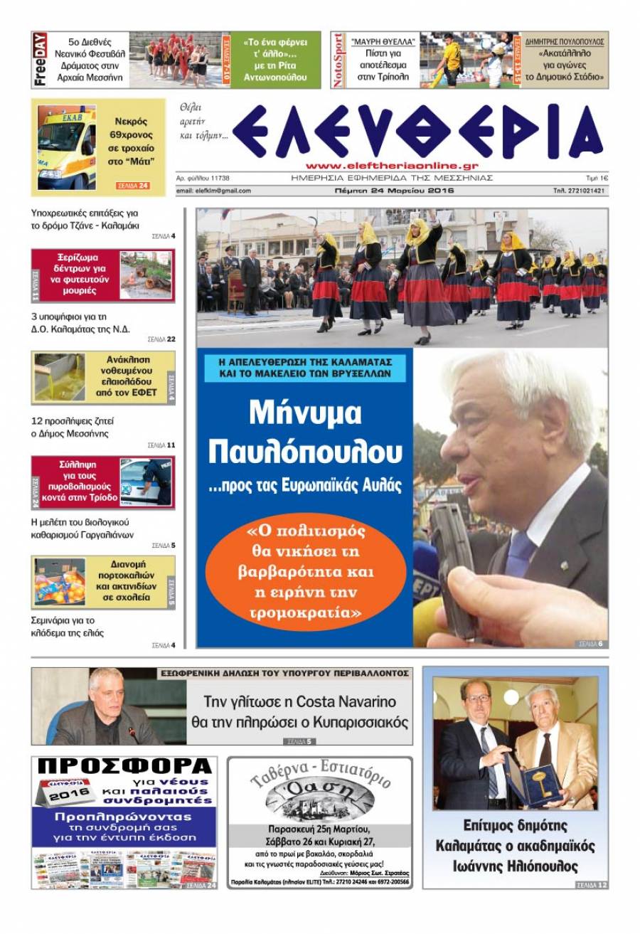 Το πρωτοσέλιδο της "Ελευθερίας" -Πέμπτη 24 Μαρτίου 2016 Για να κατεβάσετε το αρχείο πατήστε πάνω στο κουμπί που γράφει download pdf