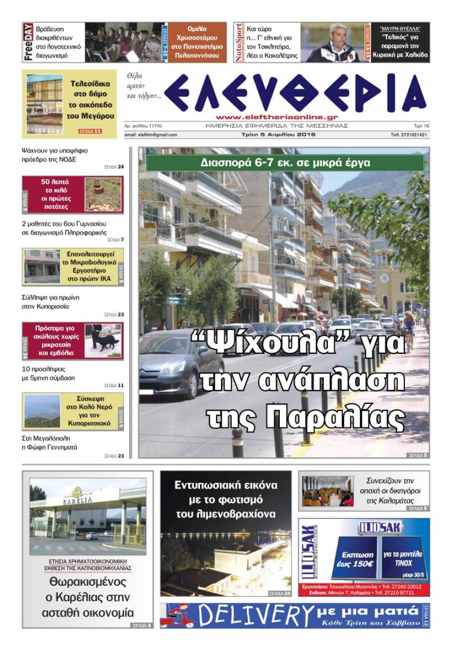 Το πρωτοσέλιδο της "Ελευθερίας" - Tρίτη 5 Απριλίου 2016 Για να κατεβάσετε το αρχείο πατήστε πάνω στο κουμπί που γράφει download pdf