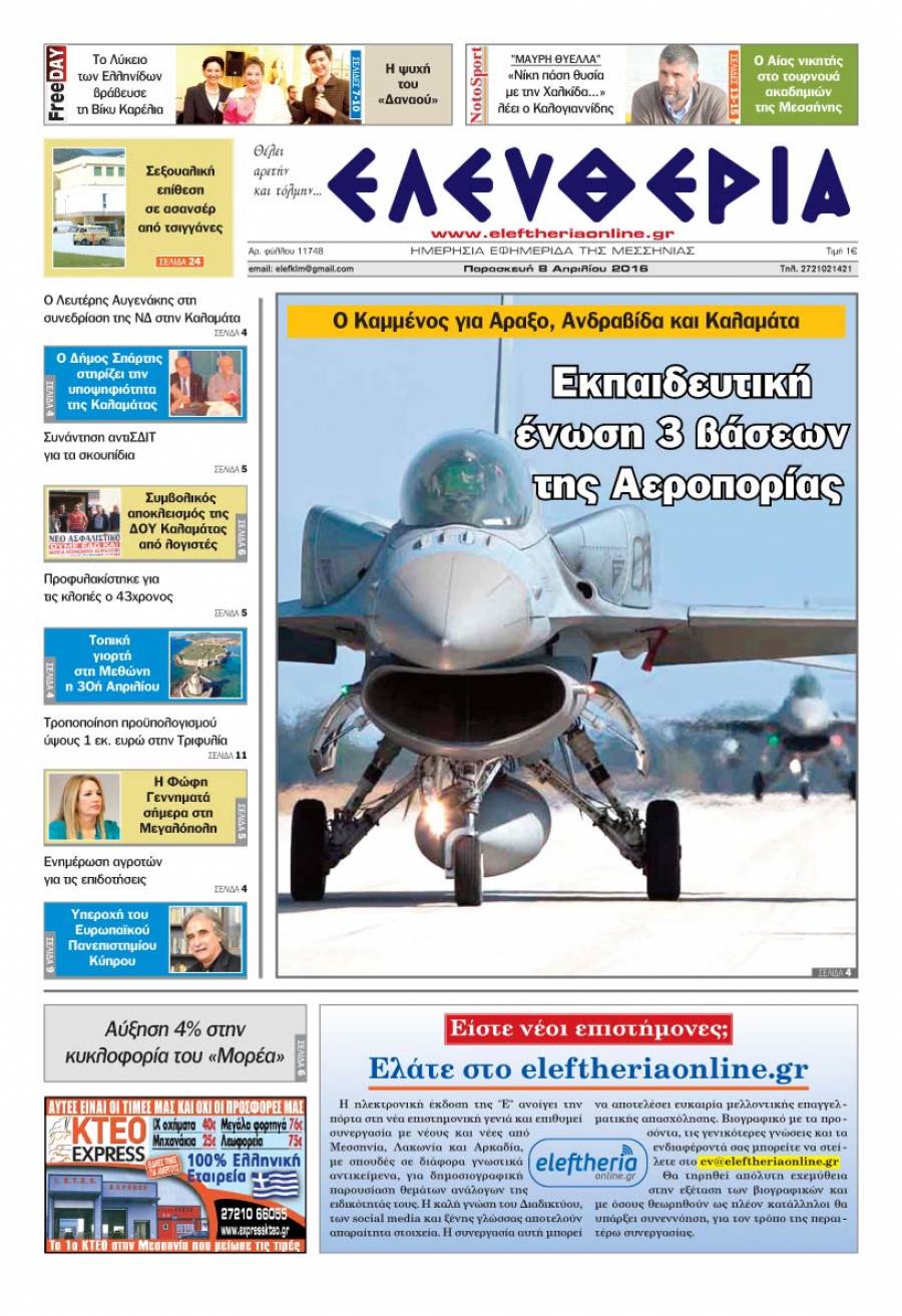 Το πρωτοσέλιδο της "Ελευθερίας" - Παρασκεή 8 Απριλίου 2016 Για να κατεβάσετε το αρχείο πατήστε πάνω στο κουμπί που γράφει download pdf