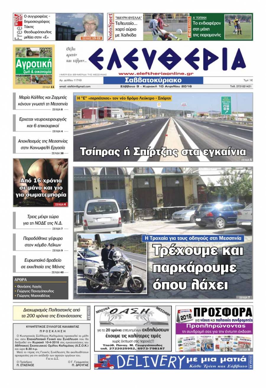 Το πρωτοσέλιδο της "Ελευθερίας Σαββατοκύριακο" 9-10 Απριλίου 2016 Για να κατεβάσετε το αρχείο πατήστε πάνω στο κουμπί που γράφει download pdf