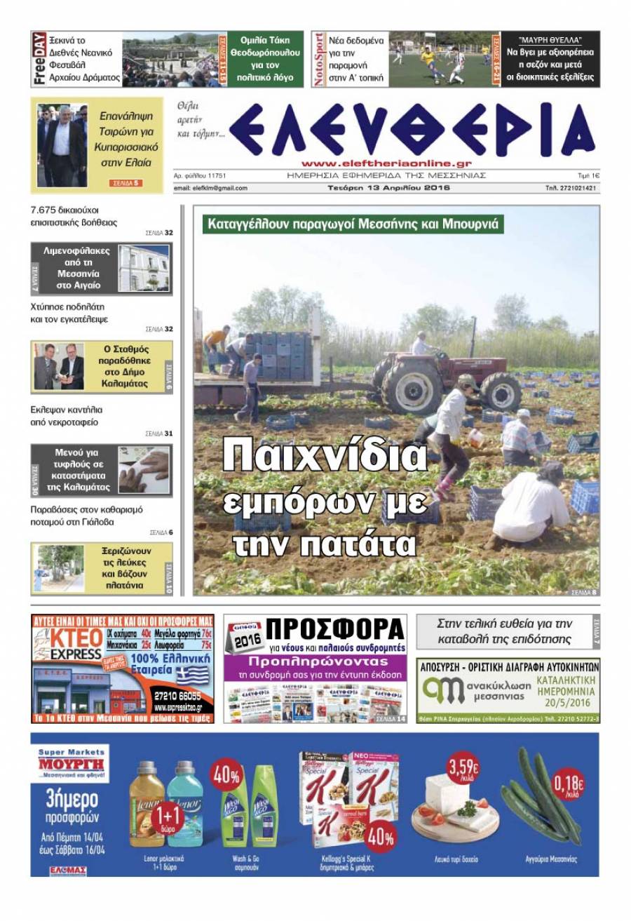 Το πρωτοσέλιδο της "Ελευθερίας" - Τετάρτη 13 Απριλίου 2016 Για να κατεβάσετε το αρχείο πατήστε πάνω στο κουμπί που γράφει download pdf
