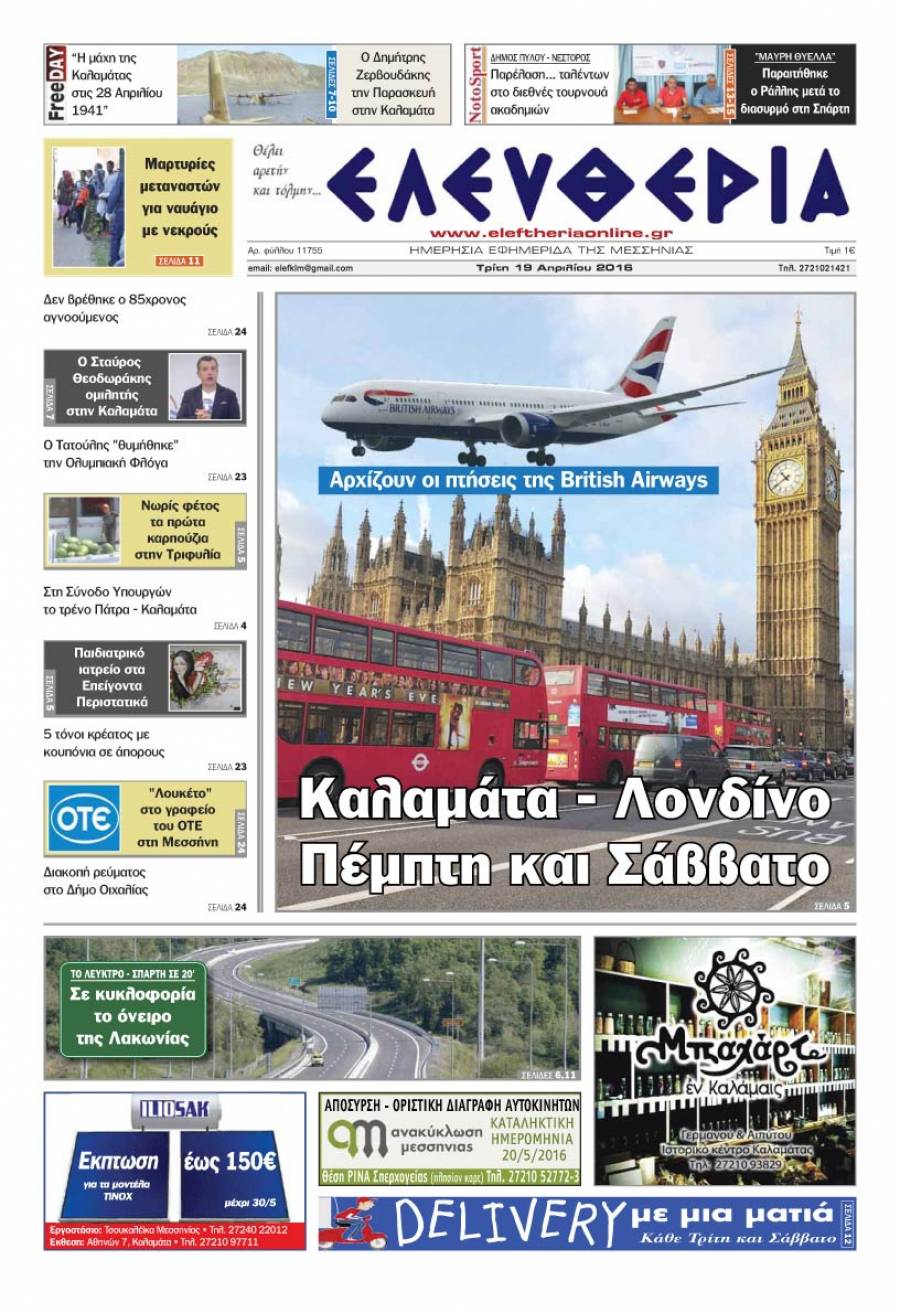 Το πρωτοσέλιδο της "Ελευθερίας - Τρίτη 19 Απριλίου 2016 Για να κατεβάσετε το αρχείο πατήστε πάνω στο κουμπί που γράφει download pdf