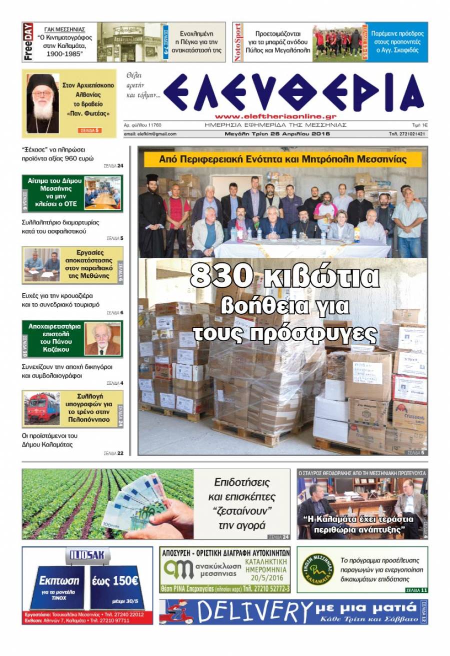 Το πρωτοσέλιδο της "Ελευθερίας" - Τρίτη 26 Απριλίου 2016 Για να κατεβάσετε το αρχείο πατήστε πάνω στο κουμπί που γράφει download pdf