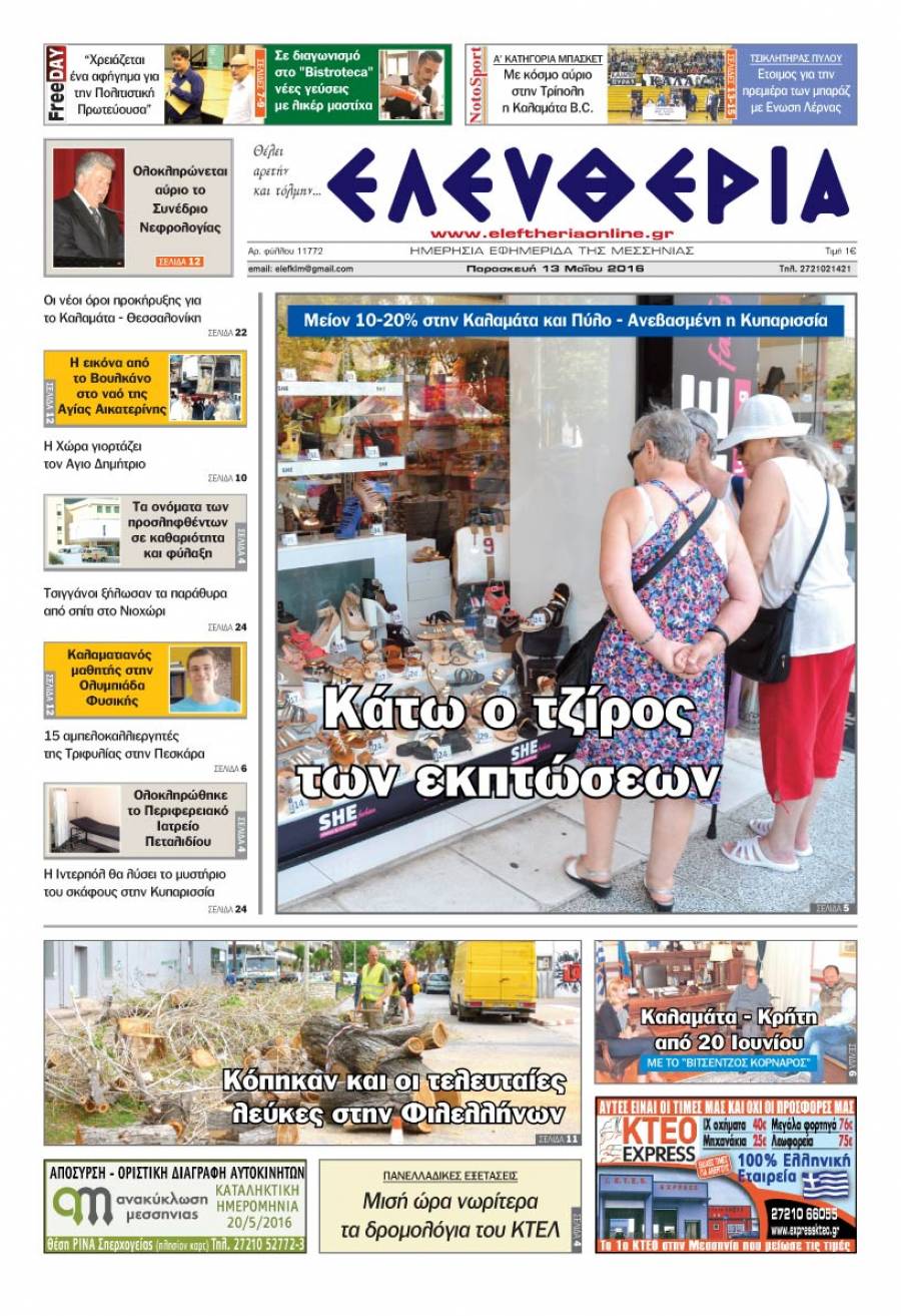 Το πρωτοσέλιδο της "Ελευθερίας" - Παρασκευή 13 Μαΐου 2016 Για να κατεβάσετε το αρχείο πατήστε πάνω στο κουμπί που γράφει download pdf
