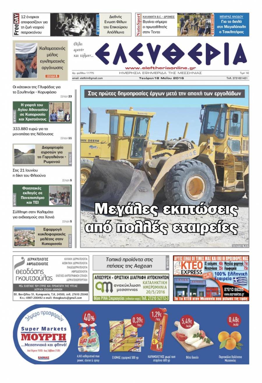 Το πρωτοσέλιδο της "Ελευθερίας" - Τετάρτη 18 Μαΐου 2016 Για να κατεβάσετε το αρχείο πατήστε πάνω στο κουμπί που γράφει download pdf
