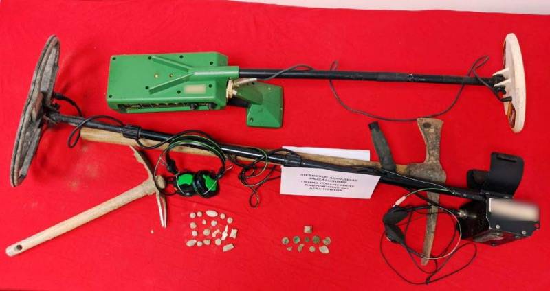 Συγκεκριμένα κατασχέθηκαν ένα χάλκινο νόμισμα ελληνιστικών χρόνων, ένα μολύβδινο βλήμα σφενδόνης με γράμματα, ένας μολύβδινος πεσσός, οκτώ μολύβδινα σφαιροειδή βλήματα, πέντε μολύβδινα αντικείμενα, δύο χάλκινα αντικείμενα, εννέα χάλκινα νομίσματα, εκ των οποίων πέντε ακέραια και τέσσερα αποσπασματικά ελληνιστικών, ρωμαϊκών και οθωμανικών χρόνων, όπως επίσης μία μολύβδινη πυραμιδόσχημη αγνίθα. Επίσης κατασχέθηκαν δύο ανιχνευτές μετάλλων και ισάριθμα σκαπτικά εργαλεία και ακουστικά, ως μέσα διενέργειας ανασκαφικών δραστηριοτήτων.