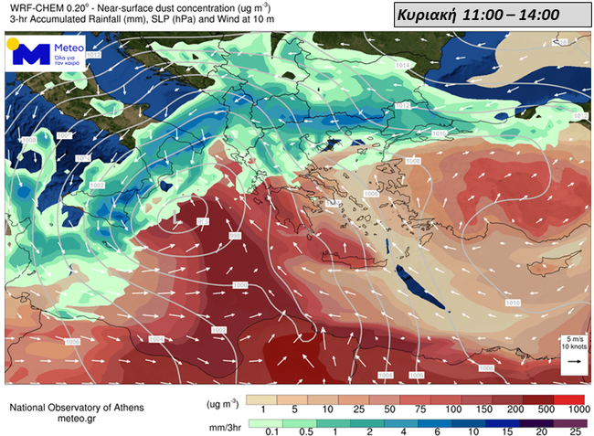 Παράλληλα, η κίνηση του βαρομετρικού χαμηλού θα προκαλέσει βαθμιαία ενίσχυση των νοτίων ανέμων στα νότια πελάγη και ιδιαίτερα αυξημένες συγκεντρώσεις σκόνης κυρίως στα κεντρικά, δυτικά και νότια τμήματα.
