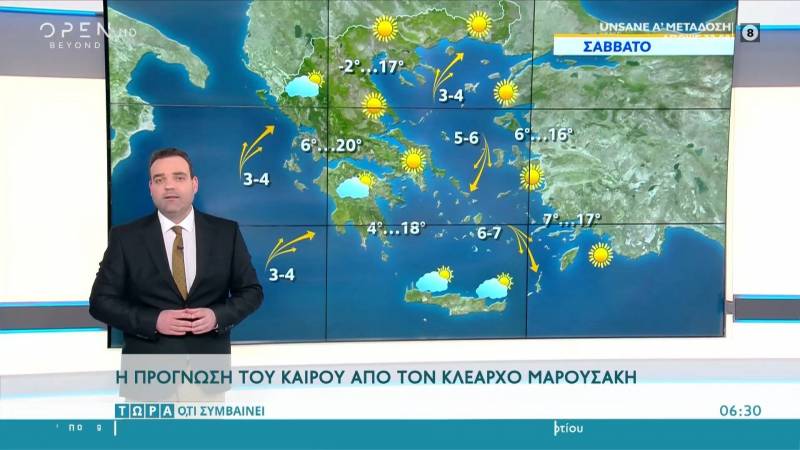 Γενικά αίθριος καιρός προβλέπεται σε όλη τη χώρα το Σάββατο. Οι άνεμοι θα πνέουν στα νοτιοανατολικά πελάγη βόρειοι βορειοδυτικοί 7 με 8 μποφόρ. Η θερμοκρασία θα σημειώσει μικρή άνοδο στο Ιόνιο και τα ηπειρωτικά ως προς τις μέγιστες τιμές της.