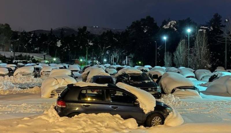Τα οχήματα όσων είχαν μπει στο πάρκινγκ του νοσοκομείου Γεννηματάς το πρωί της Δευτέρας είναι ακόμη πλήρως αποκλεισμένα. Το πάρκινγκ είναι θαμμένο στο χιόνι καθιστώντας αδύνατο για τους οδηγούς να μετακινήσουν τα αυτοκίνητα τους.