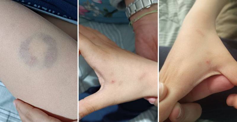 Η μητέρα του, περιγράφει το εξής: «Την περασμένη Τρίτη, όταν πήγα να πάρω το παιδί μου από το σχολείο, είδα με έκπληξη ότι αυτό έφερε γρατσουνιές πίσω από το δεξί αυτί του και στους καρπούς των χεριών του. Ρώτησα τη δασκάλα του γιου μου τι συνέβη, καθώς το παιδί μου όταν έφυγε το πρωί από το σπίτι μας δεν έφερε κάποιο τραύμα. Η ίδια μου απάντησε ότι τα συγκεκριμένα τραύματα προκλήθηκαν από την προσπάθεια που έκανε η Διευθύντρια και δασκάλα του σχολείου να απομακρύνει από κοντά της το παιδί μου, το οποίο της είχε πιάσει τα μαλλιά της. Η έκπληξή μου συνεχίστηκε όταν έφτασα σπίτι μας και άλλαξα ρούχα στον γιο μου, και πήγα να τον κάνω μπάνιο όπου, εκεί, κατεβάζοντας τη φόρμα του, είδα μια τεράστια μελανιά - δαγκωματιά στο μέσο του ποδιού του, μάλιστα πρόκειται για μια μελανιά (όπως βλέπετε και στις φωτογραφίες) όπου φαίνονται ίχνη δοντιών. Αυτό με έκανε αμέσως να καταλάβω ότι κάποιος δάγκωσε τον γιο μου δυνατά στο σημείο αυτό».