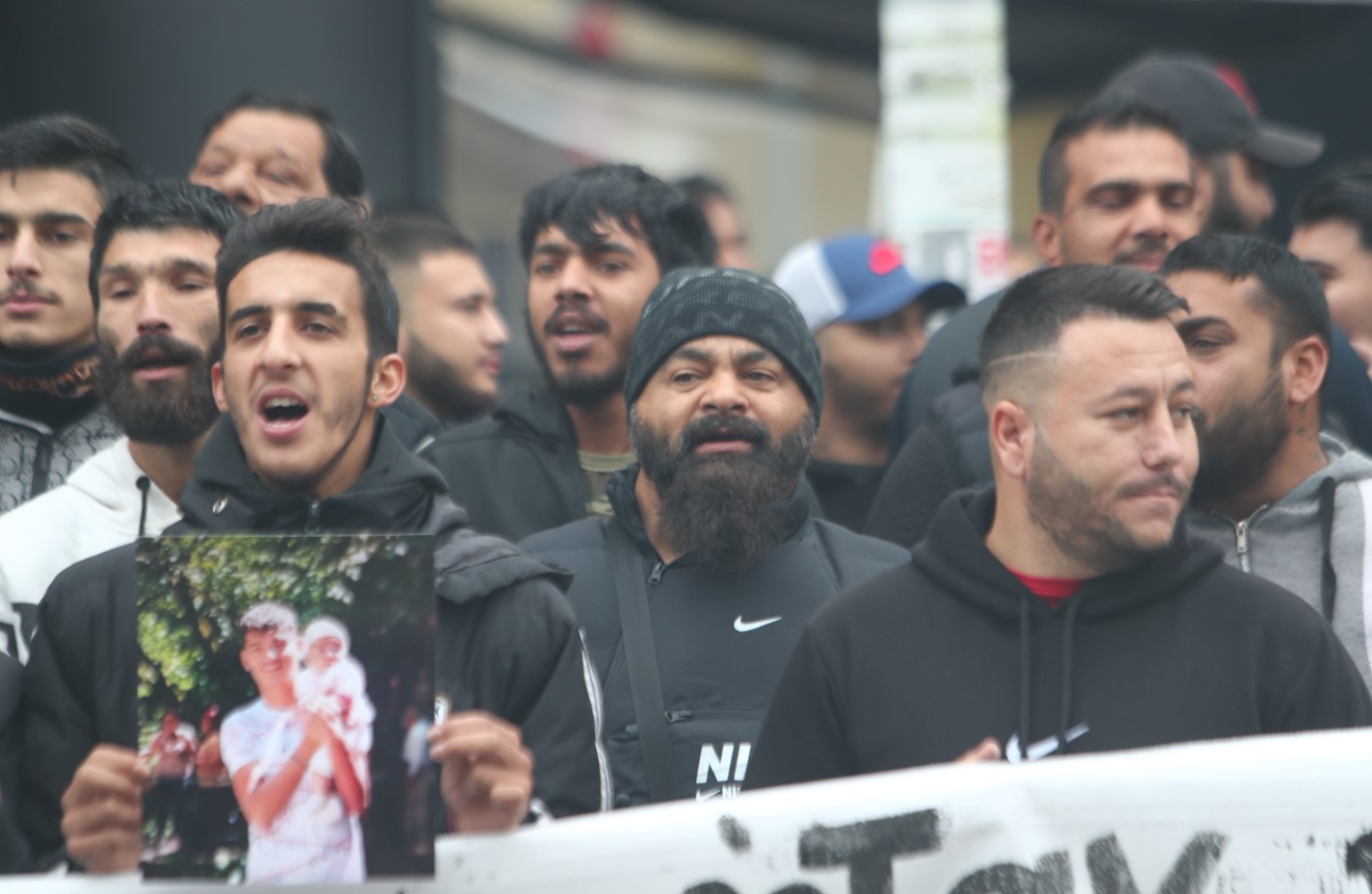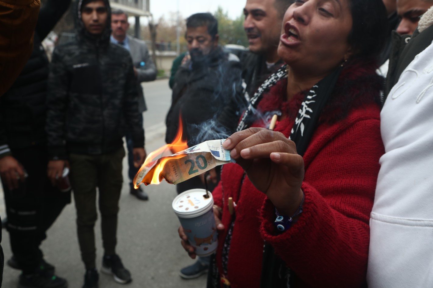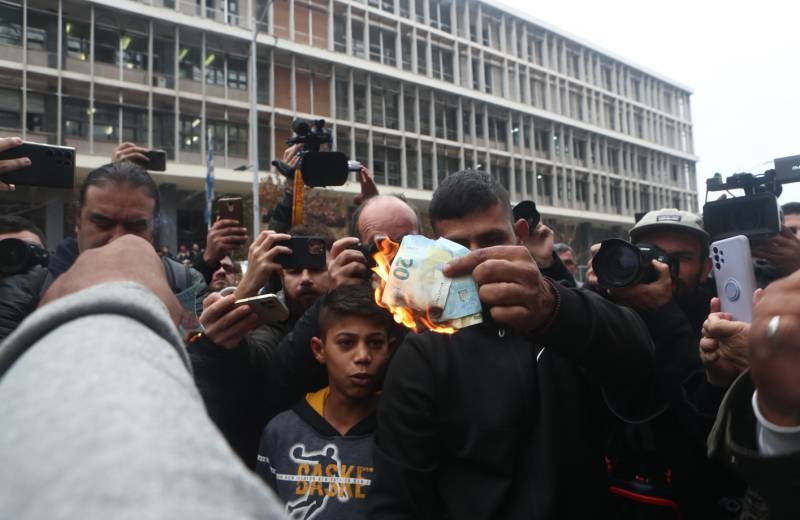 Οι συγκεντρωμένοι κρατούν φωτογραφίες του 16χρονου Ρομά και έκαψαν χαρτονομίσματα.