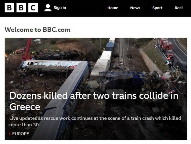 Πρώτο θέμα και στο BBC η τραγωδία στα Τέμπη με το μεγάλο μέσο ενημέρωσης να γράφει: «Μια αμαξοστοιχία που λέγεται ότι μετέφερε περίπου 350 επιβάτες συγκρούστηκε με μια εμπορική αμαξοστοιχία που ταξίδευε προς την αντίθετη κατεύθυνση κοντά στην πόλη της Λάρισας αργά το βράδυ της Τρίτης».