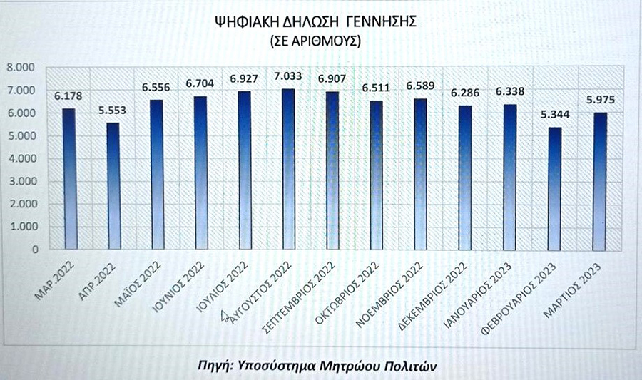 Στο γράφημα φαίνονται οι ψηφιακές δηλώσεις γέννησης κατά το χρονικό διάστημα Μαρτίου 2022 - Μαρτίου 2023.