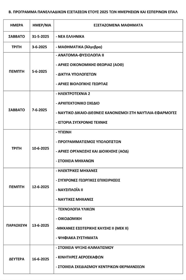 Αντίστοιχα, όπως αναφέρει το ΑΠΕ-ΜΠΕ, για τα ΕΠΑΛ, οι εξετάσεις θα αρχίσουν στις 31 Μαΐου με το μάθημα των Νέων Ελληνικών, θα συνεχιστούν με τα Μαθηματικά (άλγεβρα) στις 3 Ιουνίου και στο διάστημα 5-16 Ιουνίου 2025 οι υποψήφιοι θα εξετάζονται σε μαθήματα ειδικότητας.