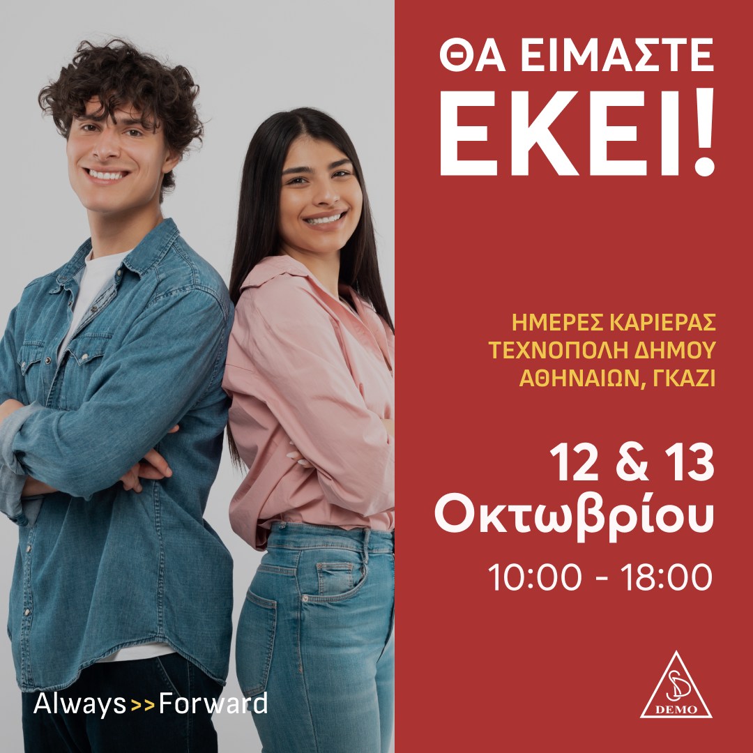 Για δύο ημέρες, το Σάββατο 12 και την Κυριακή 13 Οκτωβρίου, η DEMO καλεί τους ενδιαφερόμενους να επισκεφθούν το ειδικά διαμορφωμένο περίπτερό της στην Τεχνόπολη Δήμου Αθηναίων, να ενημερωθούν για την κουλτούρα και την αναπτυξιακή πορεία της εταιρείας, να ανταλλάξουν απόψεις με εκπροσώπους και επικεφαλής αλλά και να πραγματοποιήσουν σύντομες 1:1 συνεντεύξεις για ενεργές θέσεις εργασίας.