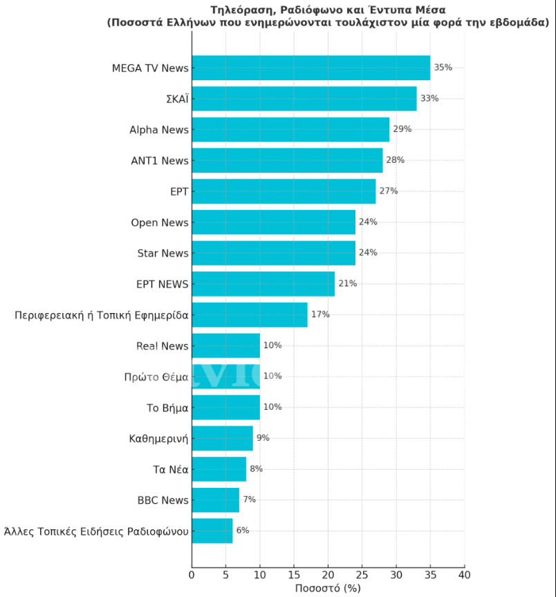 Από τις εφηµερίδες µέσω των οποίων ενηµερώνονται οι Έλληνες τουλάχιστον µία φορά την εβδοµάδα, η τοπική εφηµερίδα έρχεται µακράν πρώτη µε ποσοστό 17%, ενώ ακολουθούν η Real News, το Πρώτο Θέµα και το Βήµα µε 10%, η Καθηµερινή µε 9% και τα Νέα µε 8%.