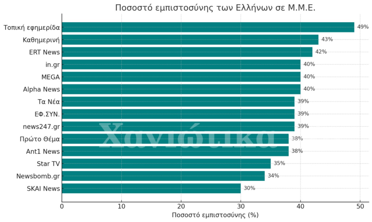 Μεγάλη πρωτιά για τον Περιφερειακό Τύπο και στον τοµέα της εµπιστοσύνης των πολιτών απέναντι στα Μ.Μ.Ε., µε την τοπική εφηµερίδα να καταγράφει ποσοστό εµπιστοσύνης 49%,, το µεγαλύτερο στην Ελλάδα, αφήνοντας στη δεύτερη θέση την εφηµερίδα ‘‘Καθηµερινή’’ µε ποσοστό 43%, ενώ ακολουθούν η ΕΡΤ µε 42%, και το in.gr, ο ALPHA και το MEGA µε ποσοστό 40%.