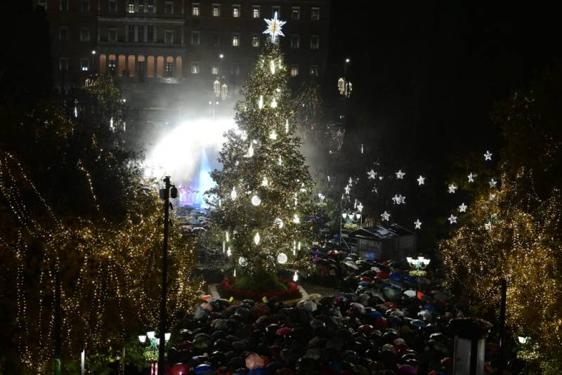 Λίγο μετά τις 7:30 ο Χάρης Δούκας φωταγώγησε το έλατο ύψους 19 μέτρων, που έφτασε στην Αθήνα από το Χρυσοβίτσι Αρκαδίας και τον εορταστικό διάκοσμο όλης της πλατείας. Κόκκινες και χρυσές μπάλες, στολίδια από φωτισμένο plexiglass σε διάφορα σχέδια, καθώς και 3.000 μέτρα λαμπερά φωτάκια, αναδεικνύουν τη χαρούμενη ατμόσφαιρα των ημερών.