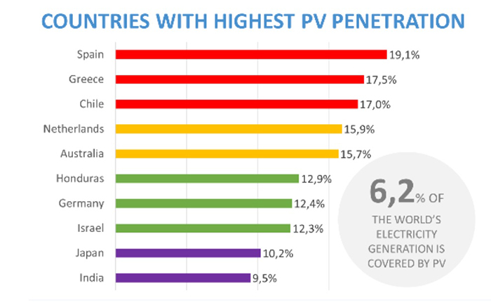 "Εννέα χώρες έχουν σήμερα ποσοστά διείσδυσης άνω του 10%, με την Ισπανία, την Ελλάδα και τη Χιλή να ξεπερνούν το 17%, και ενώ η συμφόρηση του δικτύου έχει καταστεί ζήτημα, τα μέτρα πολιτικής, οι τεχνικές λύσεις και η αποθήκευση παρέχουν ήδη εφαρμόσιμες λύσεις για την ενίσχυση της διείσδυσης των φωτοβολταϊκών", αναφέρεται στην έκθεση.