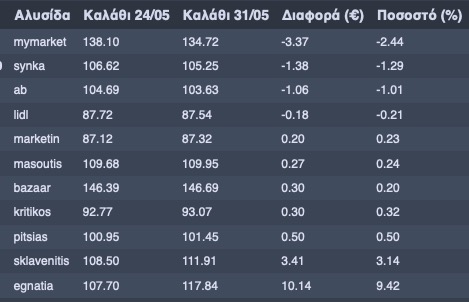 Αναλυτικά στον πίνακα που επισυνάπτεται το κόστος του «Καλαθιού του Νοικοκυριού» ανά σούπερ μάρκετ και η μεταβολή του από την 30η στην 31η εβδομάδα