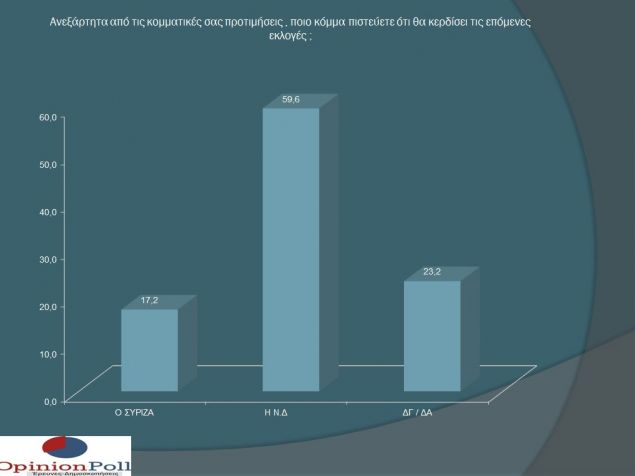 Στην παράσταση νίκης το 59,6% εμφανίζεται να θεωρεί ότι θα νικήσει η ΝΔ , έναντι ενός 17,2% που θεωρεί ότι τελικά θα νικήσει ο ΣΥΡΙΖΑ.