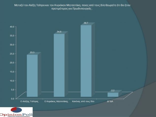 Κατά τα άλλα, ο Κυριάκος Μητσοτάκης προηγείται στην καταλληλότητα για Πρωθυπουργός με 11 μονάδες, αν και πρώτη επιλογή σ΄αυτό το ερώτημα είναι ο Κανένας.
