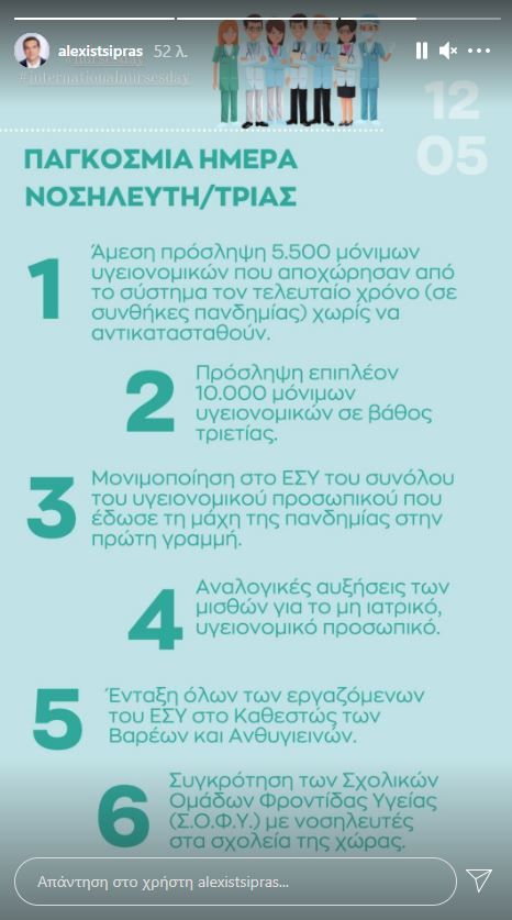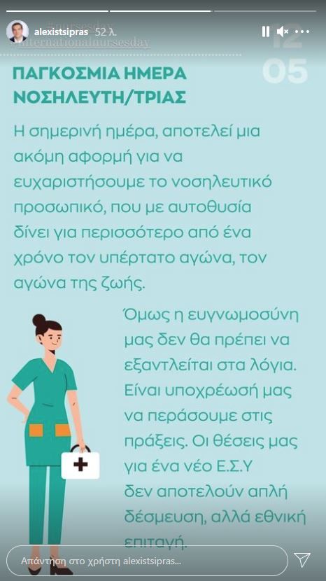 Τις θέσεις του για τον νοσηλευτικό κλάδο, με αφορμή την παγκόσμια ημέρα νοσηλευτή/τριας πρόβαλε ο Αλέξης Τσίπρας με ανάρτηση στον προσωπικό του λογαριασμό στο Instagram.