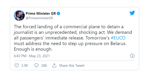 Εντονη ήταν η αντίδραση του Ελληνα πρωθυπουργού, Κυριάκου Μητσοτάκη για την υποχρεωτική προσγείωση αεροσκάφους στη Λευκορωσία και τη σύλληψη δημοσιογράφου. Με ανάρτησή του στο twitter, o Έλληνας πρωθυπουργός έγραψε στα αγγλικά: «Η αναγκαστική προσγείωση μιας εμπορικής πτήσης για να συλληφθεί δημοσιογράφος είναι μια πρωτοφανής, σοκαριστική πράξη. Απαιτούμε την άμεση απελευθέρωση όλων των επιβατών. Αύριο πρέπει να αυξήσουμε την πίεση στη Λευκορωσία. Αρκετά πια».