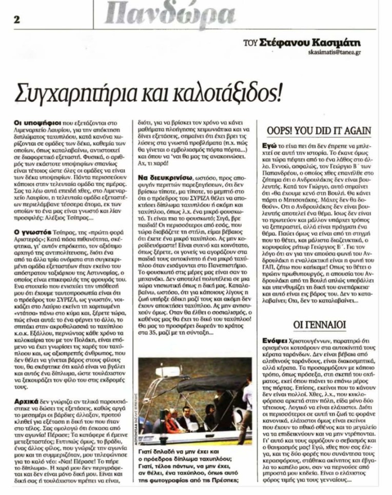 Πάντα περισσεύουν κάποιοι στην τελευταία ομάδα της ημέρας. Σας τα λέω αυτά επειδή χθες στο Λιμεναρχείο Λαυρίου η τελευταία ομάδα εξεταστέων περιελάμβανε τέσσερα άτομα εκ των οποίων το ένα μας είναι γνωστό και λίαν προσφιλές: Αλέξιος Τσίπρας…».