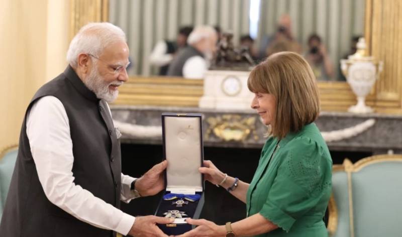 Στη συνέχεια, η Πρόεδρος της Δημοκρατίας, σε ειδική τελετή στο Προεδρικό Μέγαρο, απένειμε στον Πρωθυπουργό της Ινδίας το Παράσημο του Μεγαλόσταυρου του Τάγματος της Τιμής.