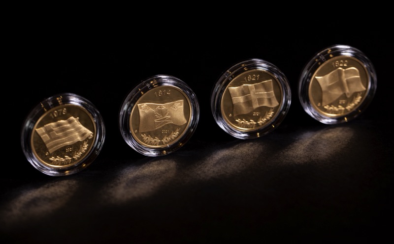 Τέλος, το Νομισματικό Πρόγραμμα ολοκληρώνεται με την τρίτη σειρά νομισμάτων, τα τέσσερα χρυσά νομίσματα που αποτυπώνουν χαρακτηριστικές ελληνικές σημαίες και διατίθενται αποκλειστικά ως μέρος της πλήρους κασετίνας, που περιλαμβάνει και τα 14 νομίσματα της συλλογής.
