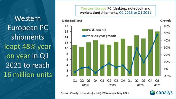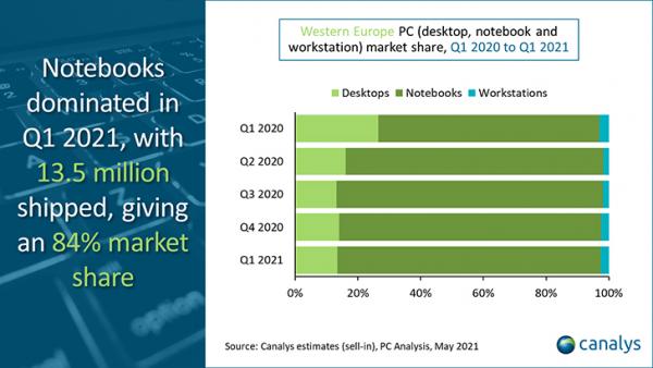 Σε επίπεδο κατασκευαστών, η HP κατέκτησε την πρώτη θέση της κατάταξης των πιο ισχυρών κατασκευαστών στην περιοχή της Δυτικής Ευρώπης για το 1ο τρίμηνο του 2021. Η εταιρεία διέθεσε στην αγορά 4,1 εκατ. συσκευές, αποσπώντας μερίδιο 26%.