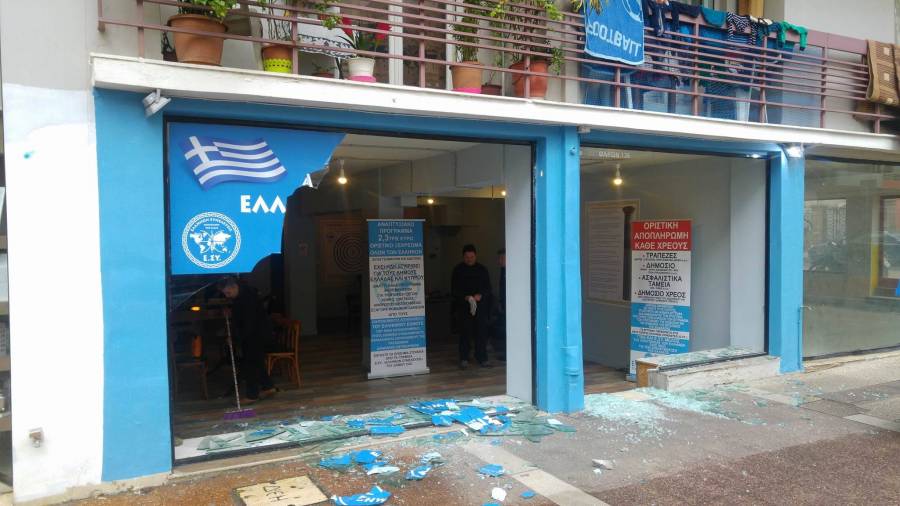 Η τζαμαρία στην είσοδο των γραφείων της οργάνωσης της "Ελλήνων Συνέλευσις" έχει καταστραφεί ολοκληρωτικά και στο χώρο, μέσα και έξω, υπάρχουν πέτρες.