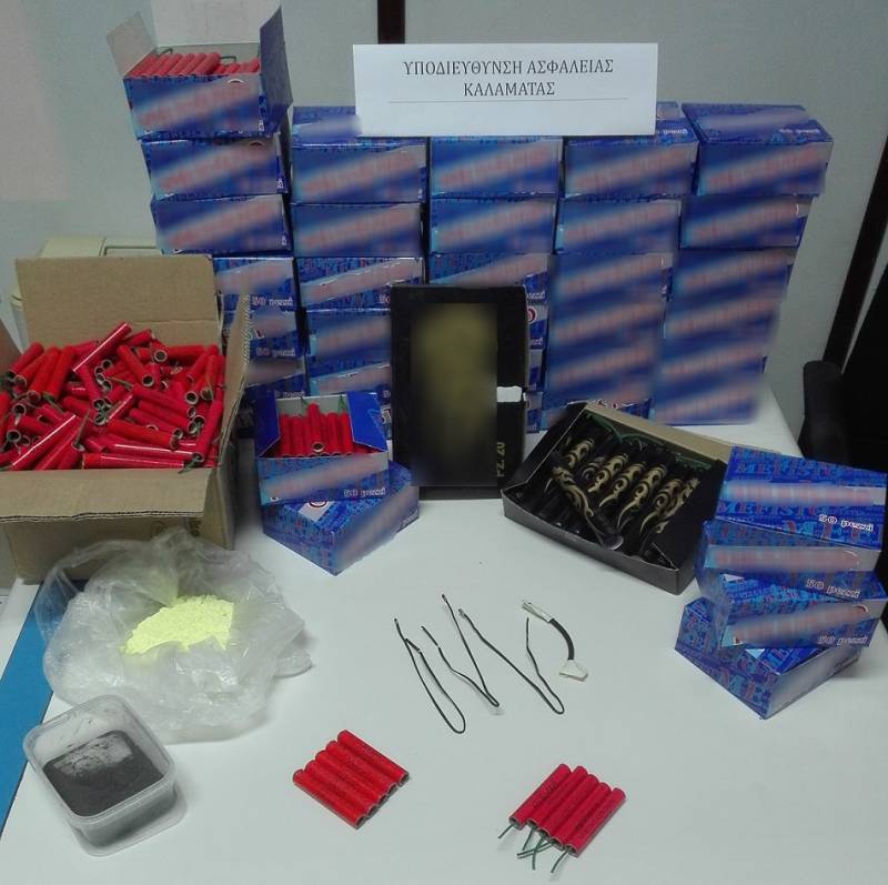 Σε έρευνα, που έγινε στο σπίτι του από αστυνομικούς της Ασφάλειας Καλαμάτας βρέθηκαν και κατασχέθηκαν 2.110 κροτίδες, πυρίτιδα συνολικού βάρους 30 γραμμαρίων, θειάφι συνολικού βάρους 90 γραμμαρίων και βραδύκαυστο φιτίλι.