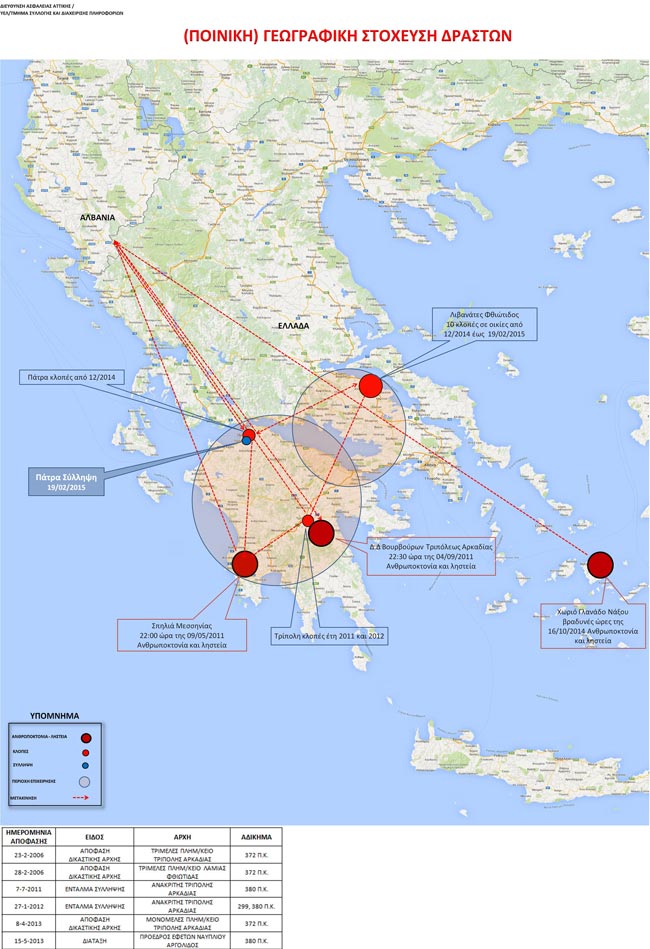 Εκκρεμούσε το υπ’ αριθμ. 2/2012 από 27/1/2012 ένταλμα σύλληψης του Ανακριτή του Πρωτοδικείου Τριπόλεως, που επικαιροποιήθηκε με το βούλευμα του Συμβουλίου Πλημμελειοδικών Τριπόλεως στις 4/7/2013 και αφορούσε έγκλημα ανθρωποκτονίας από πρόθεση με ενδεχόμενο δόλο και ληστείας κατά συναυτουργία, ανθρωποκτονία που τελέστηκε την 4/9/2011 στο Δ.Δ. Βουρβούρων Αρκαδίας σε βάρος 78χρονου ημεδαπού και απόπειρας ανθρωποκτονίας και ληστείας σε βάρος της συζύγου του, 80χρονης ημεδαπής.