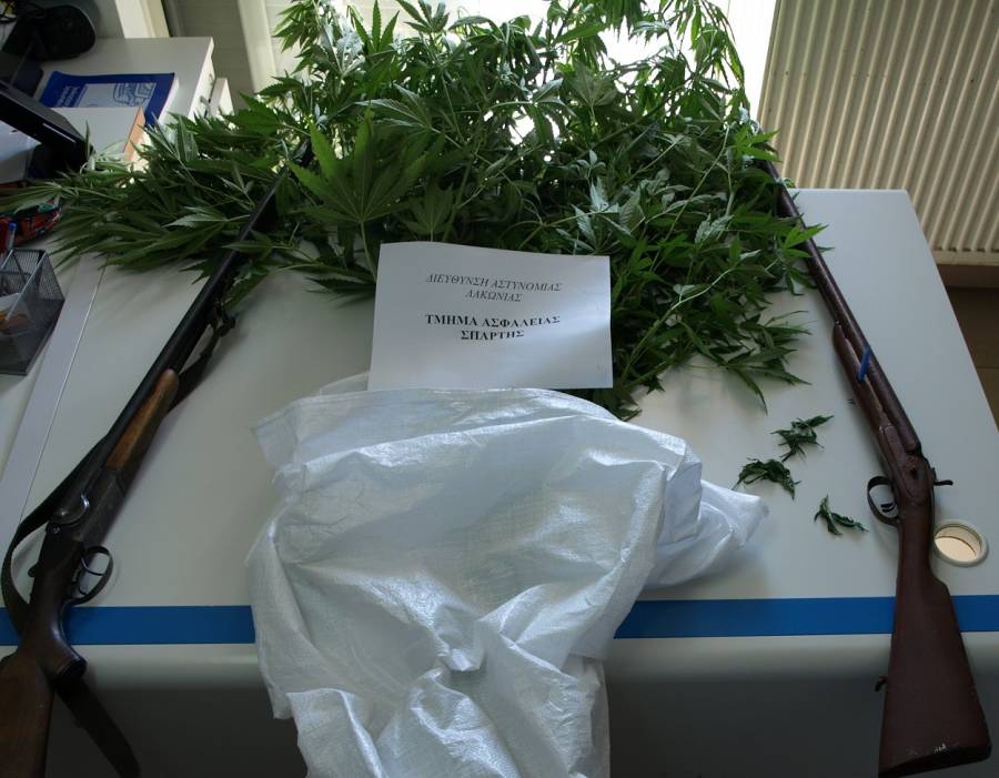 Σε έρευνα που έγινε στην οικία του, καθώς και σε εξωτερικό χώρο, βρέθηκαν συνολικά και κατασχέθηκαν, -3- δενδρύλλια κάνναβης, -3-τμήματα δενδρυλλίων κάνναβης (κορυφάδες) και -2- κυνηγετικά όπλα.