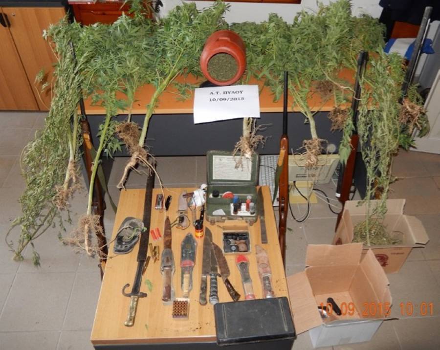 Σήμερα το πρωί μετά από σχετικές πληροφορίες αστυνομικοί έκαναν έρευνα στο σπίτι του 53χρονου, όπου εντόπισαν 9 χασισόδεντρα φυτεμένα στην αυλή, ακόμα 4 φυτεμένα σε γλάστρες στον ίδιο χώρο και επιπλέον 2 δενδρύλλια αποξηραμένα μέσα στο σπίτι. Στον εσωτερικό χώρο επίσης βρήκαν 176 γραμ. κάνναβης, τρία κυνηγετικά όπλα, πιστόλι κρότου, αεροβόλο όπλο, σπρέι πιπεριού, δύο λόγχες, μία ξιφολόγχη, πέντε σουγιάδες, ένα πτυσσόμενο στιλέτο, δύο φωτοβολίδες και 140 φυσίγγια διαφόρων τύπων και διαμετρημάτων.