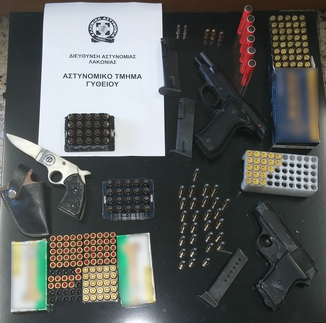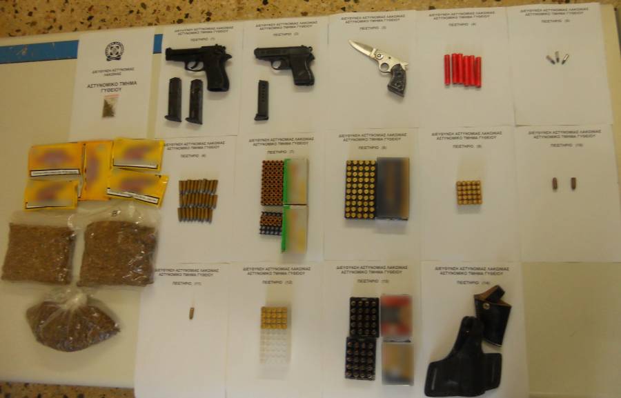 Εντοπίσθηκαν, χθες (10.6.2016) το απόγευμα, στο Μαυροβούνι Γυθείου, από αστυνομικούς του αστυνομικού Τμήματος Γυθείου, με τη συνδρομή αστυνομικών της Ομάδας Πρόληψης και Καταστολής Εγκληματικότητας (Ο.Π.Κ.Ε.) Λακωνίας, δύο πιστόλια, φυσίγγια, ποσότητα λαθραίου καπνού, κροτίδες κ.α., τα οποία κατασχέθηκαν.
