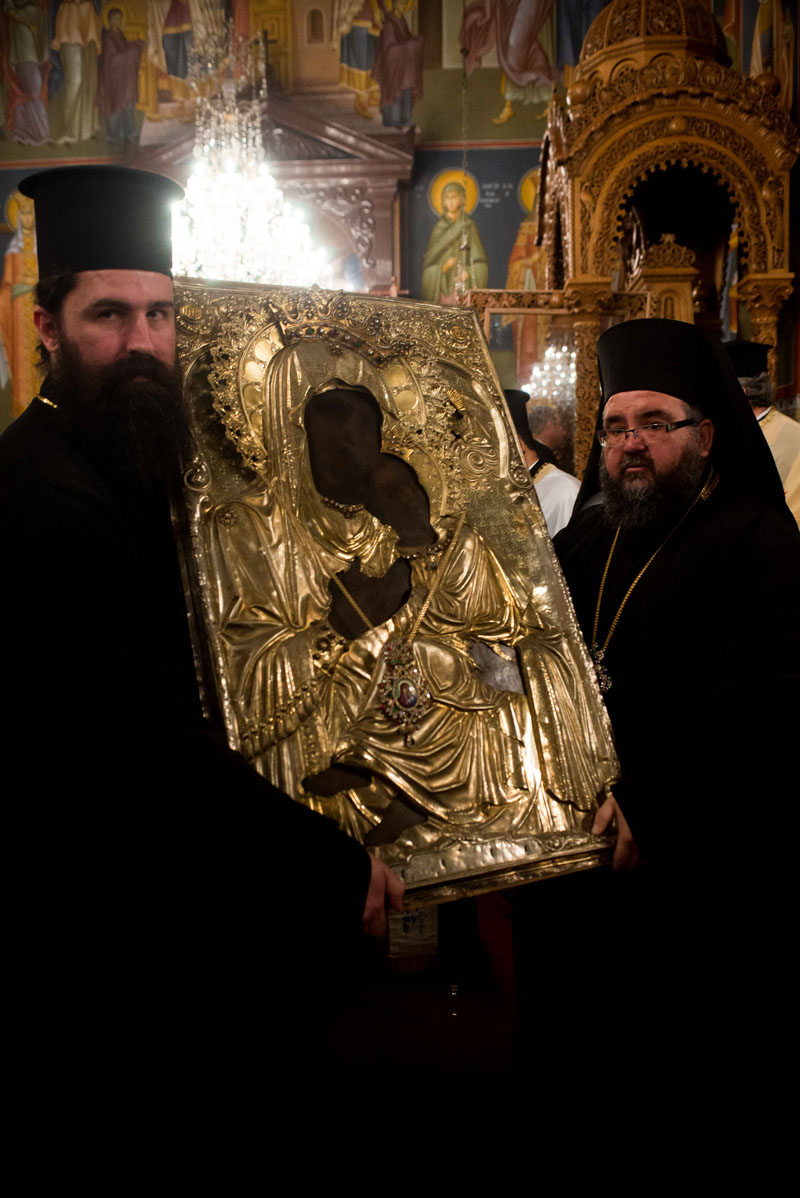 Στη συνέχεια πραγματοποιήθηκε η ενθρόνιση της εικόνας από το μόνιμο θρόνο της, στο θρόνο λιτανεύσεως.