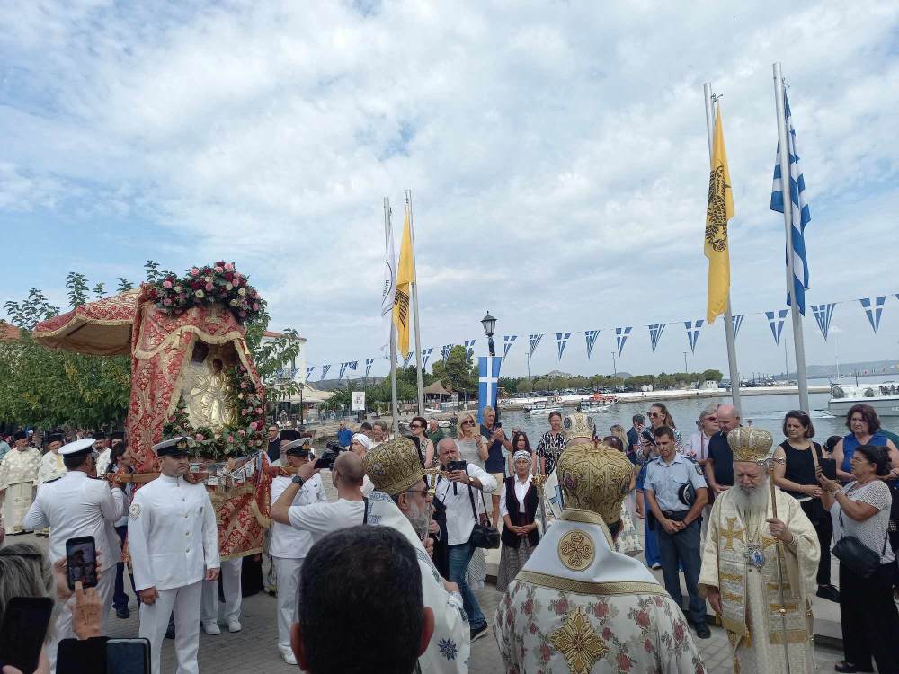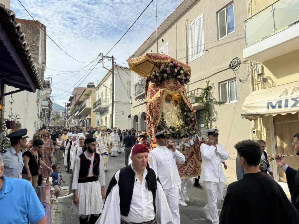 Μετά το πέρας της Θείας Λειτουργίας ξεκίνησε η λιτάνευση της Ιεράς Εικόνας της Παναγίας Μυρτιδιώτισσας στους κεντρικούς δρόμους της Πύλου.