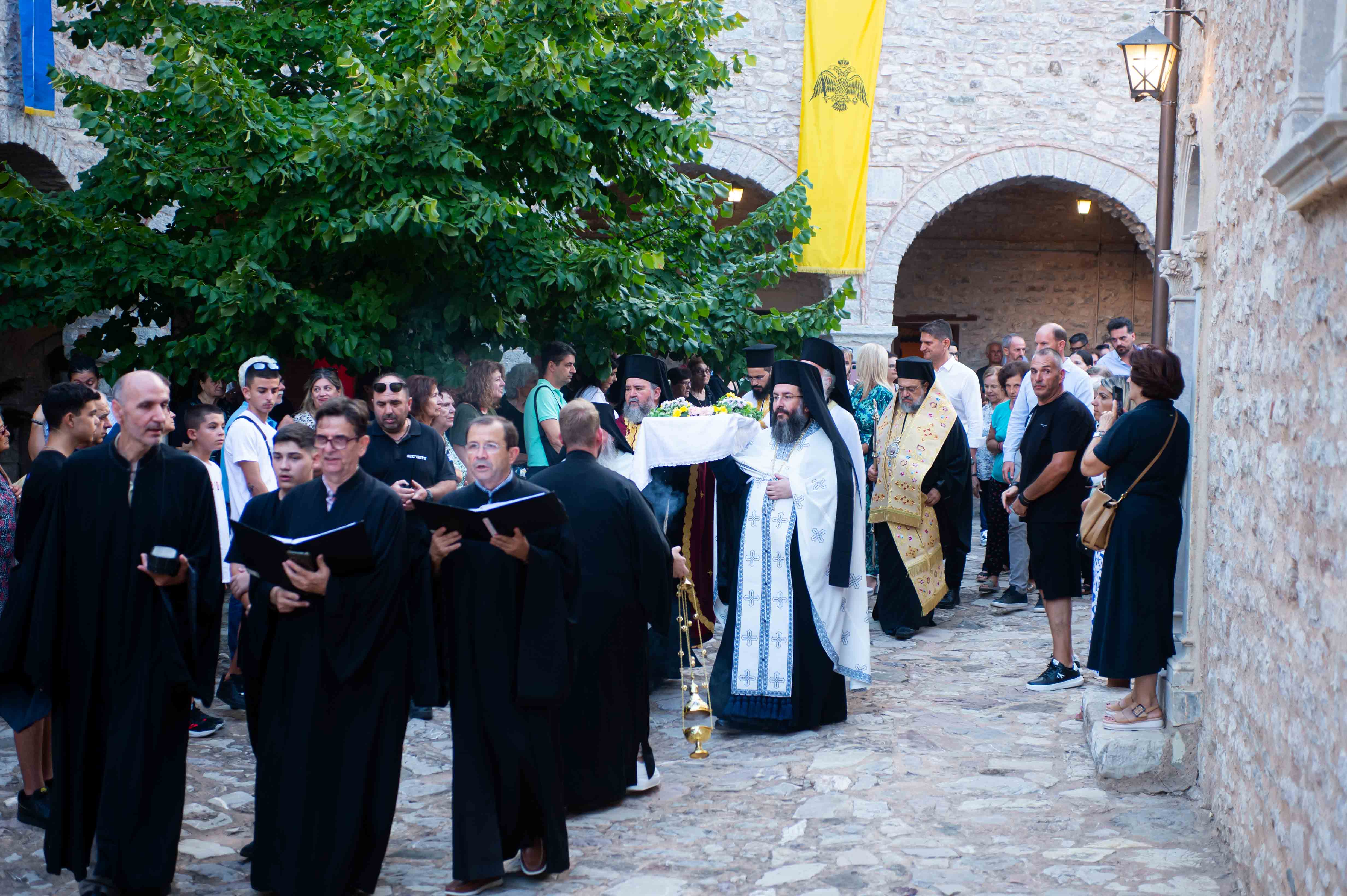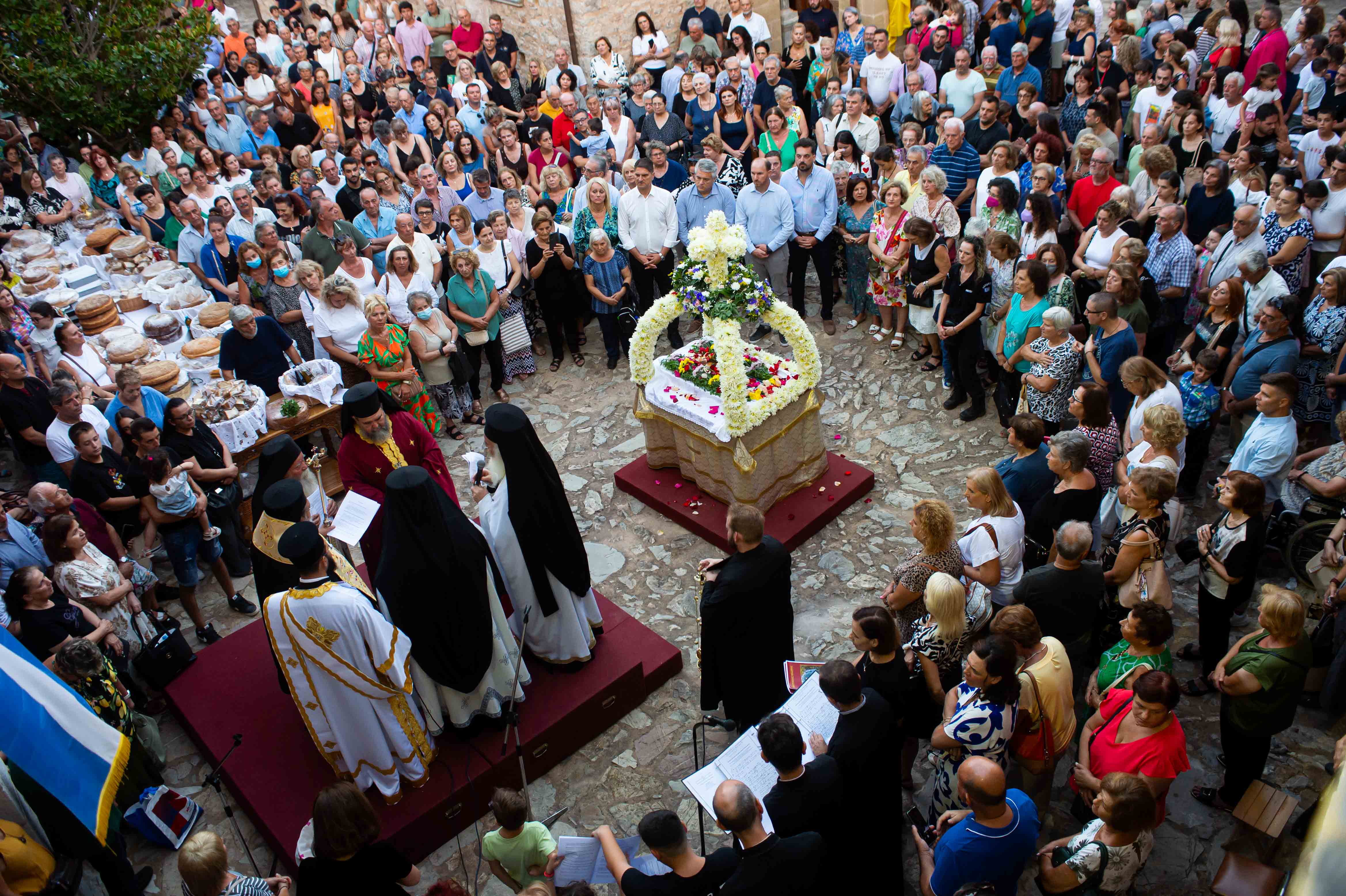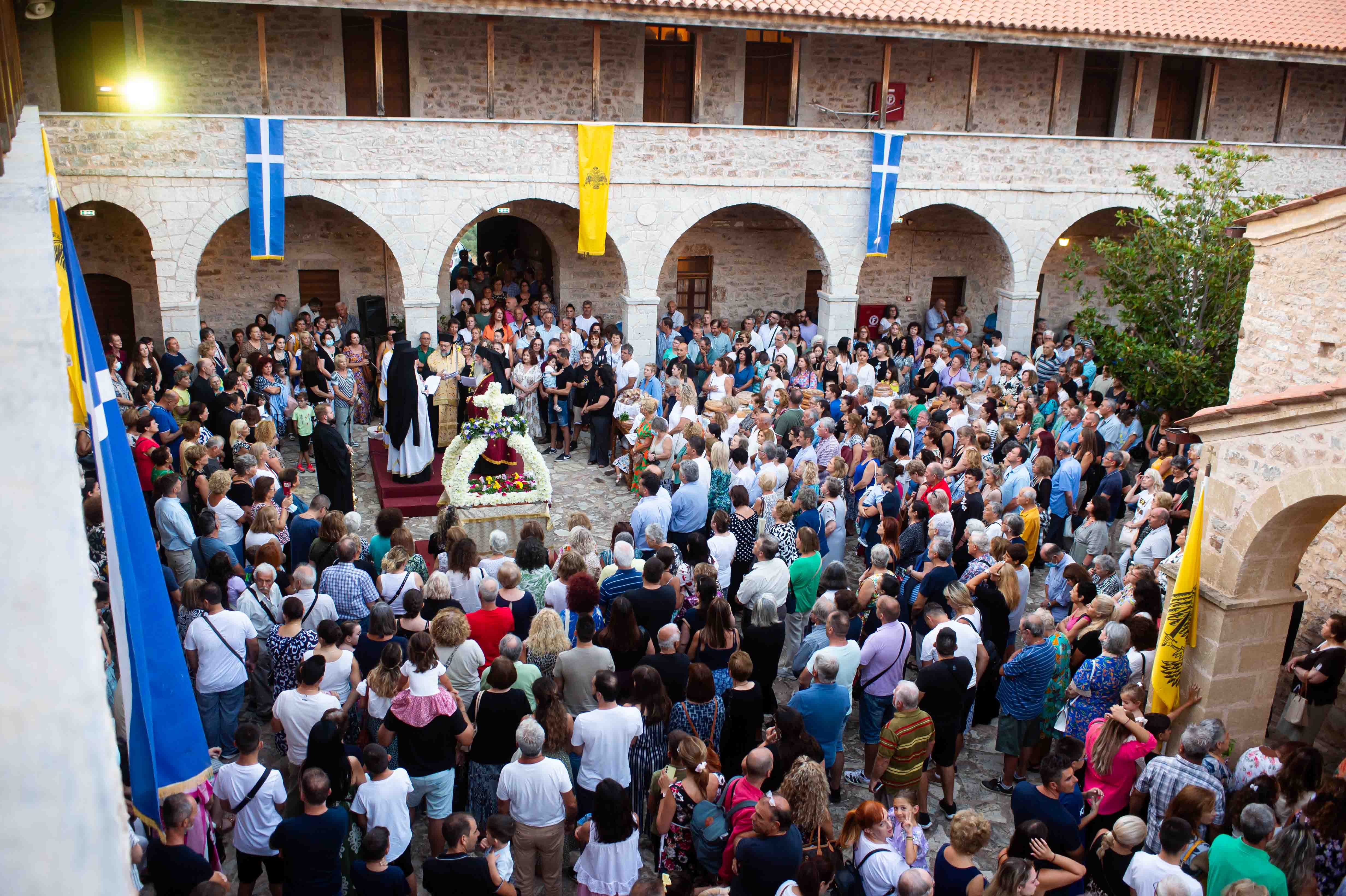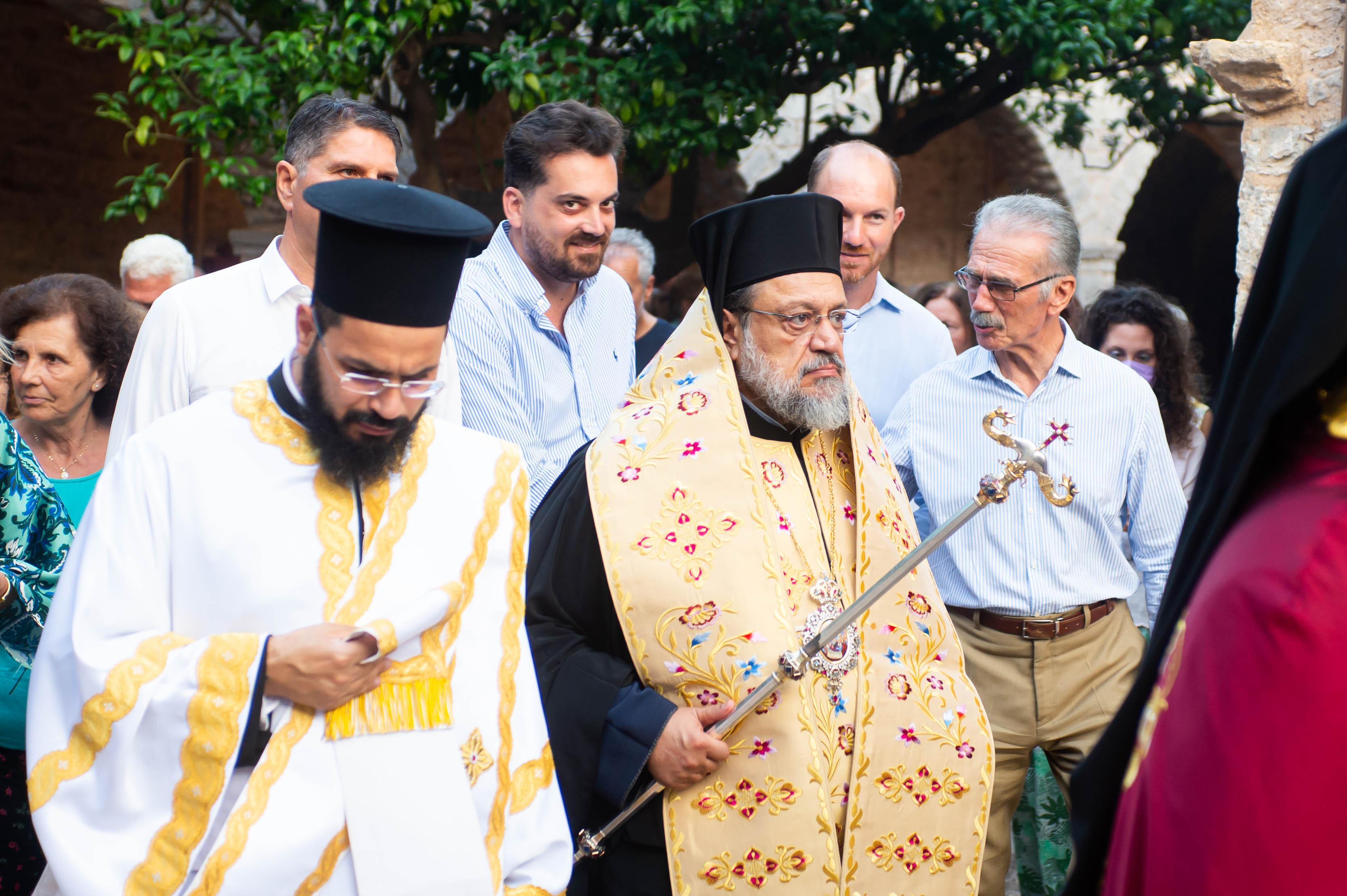 Πριν το τέλος του εσπερινού τελέσθηκε η λιτάνευση του Επιταφίου και εψάλησαν τα Εγκώμια της Θεοτόκου και εν συνεχεία η Αρτοκλασία στον αύλειο χώρο της Μονής.