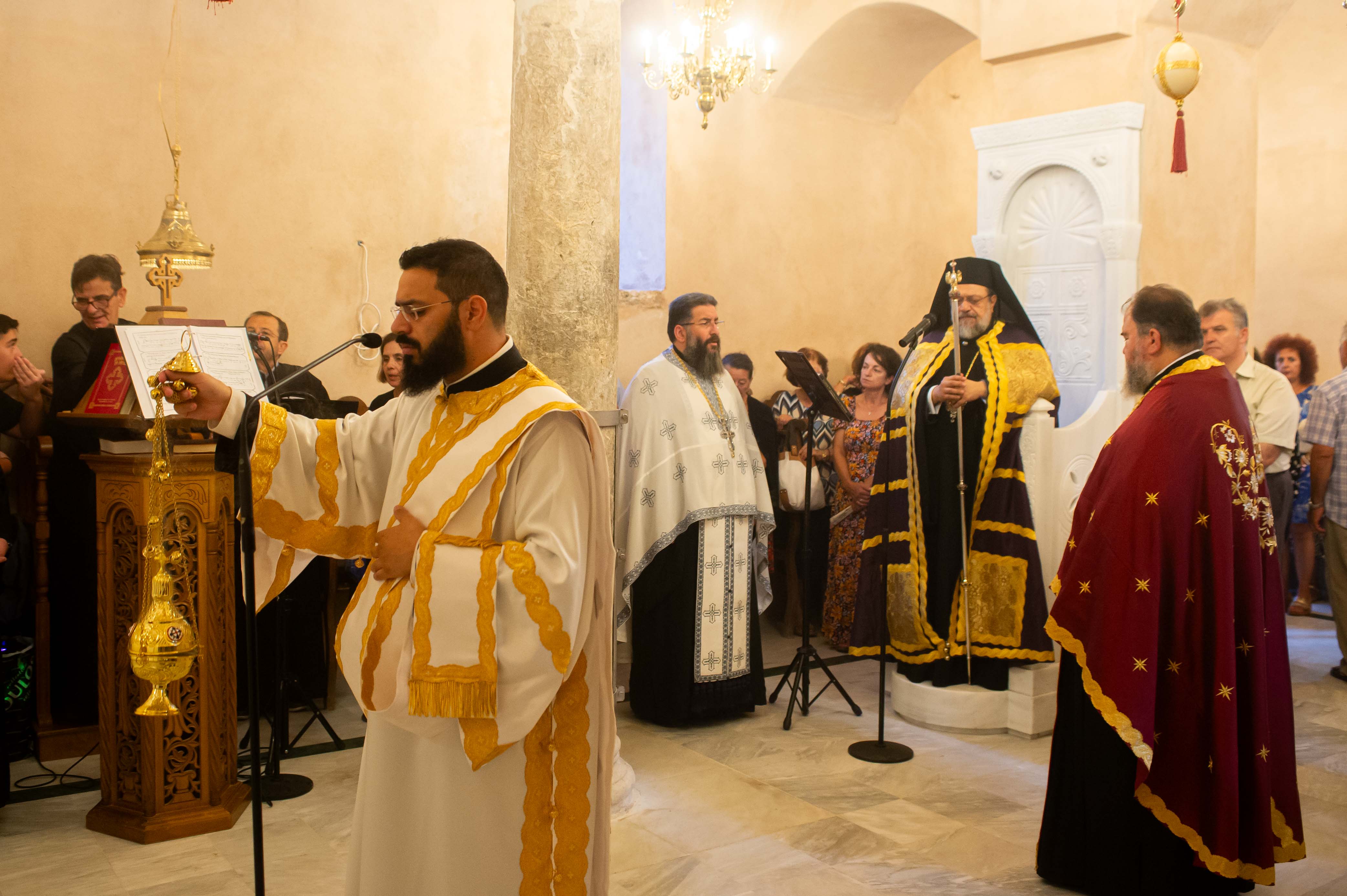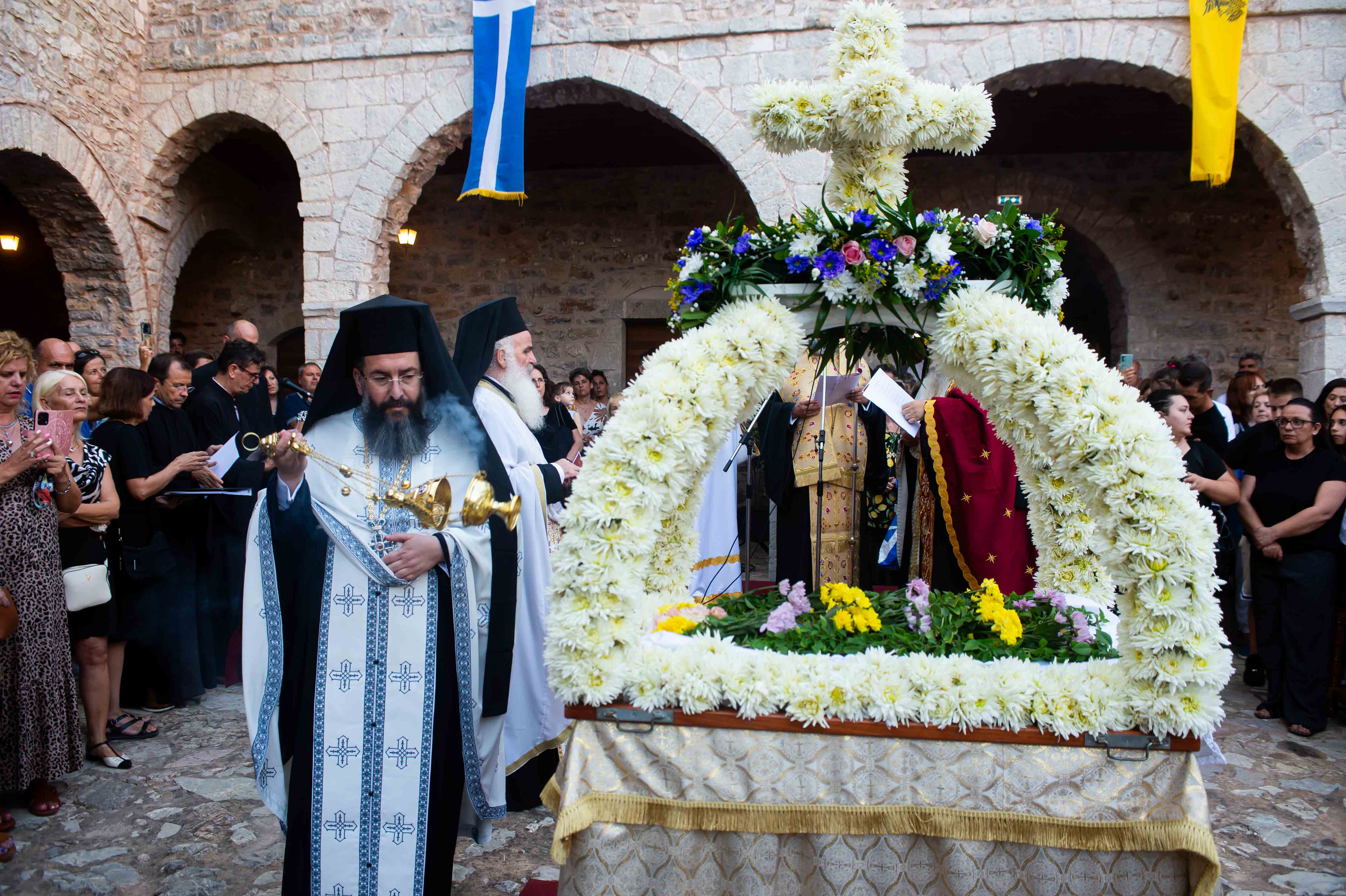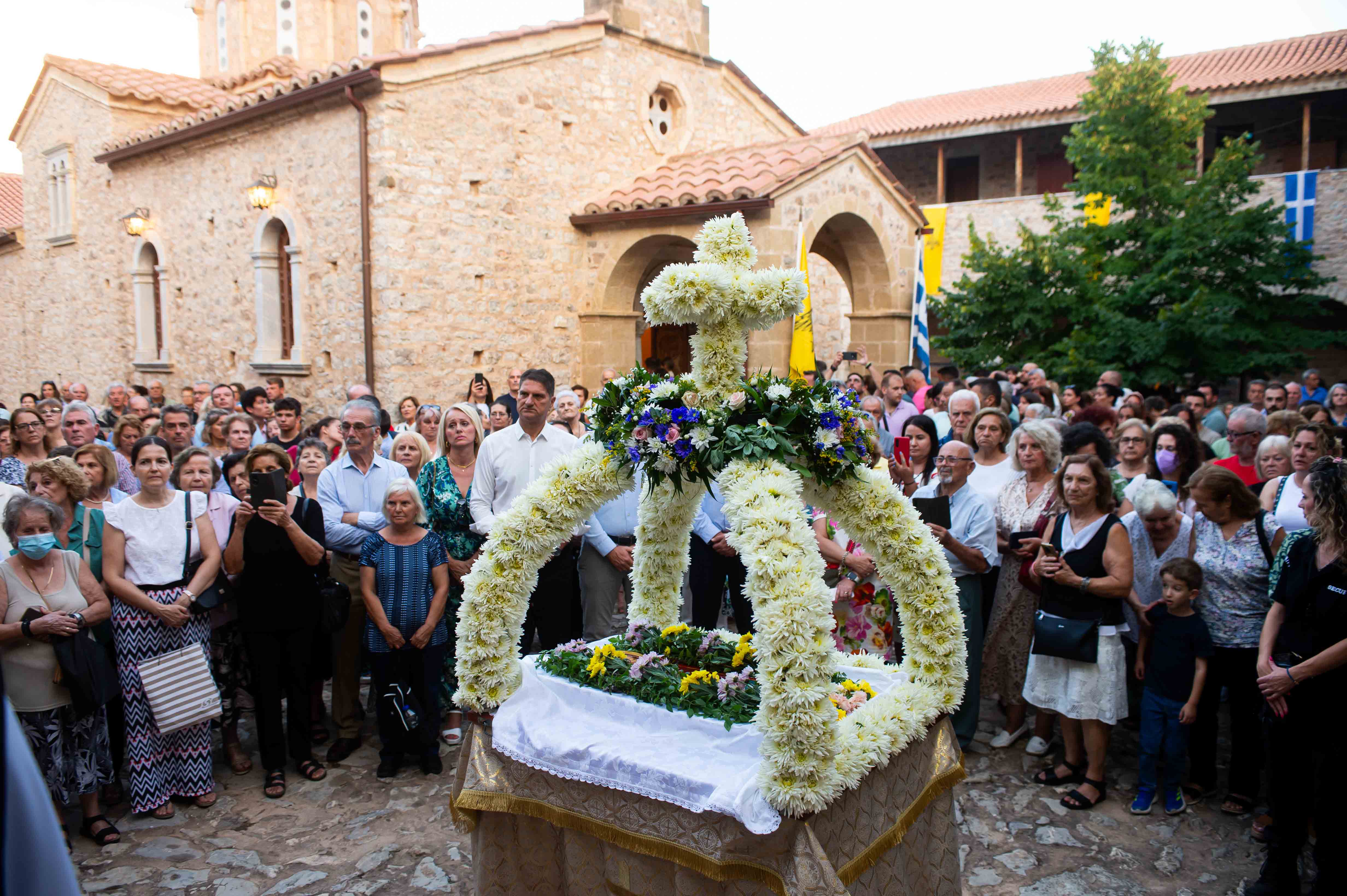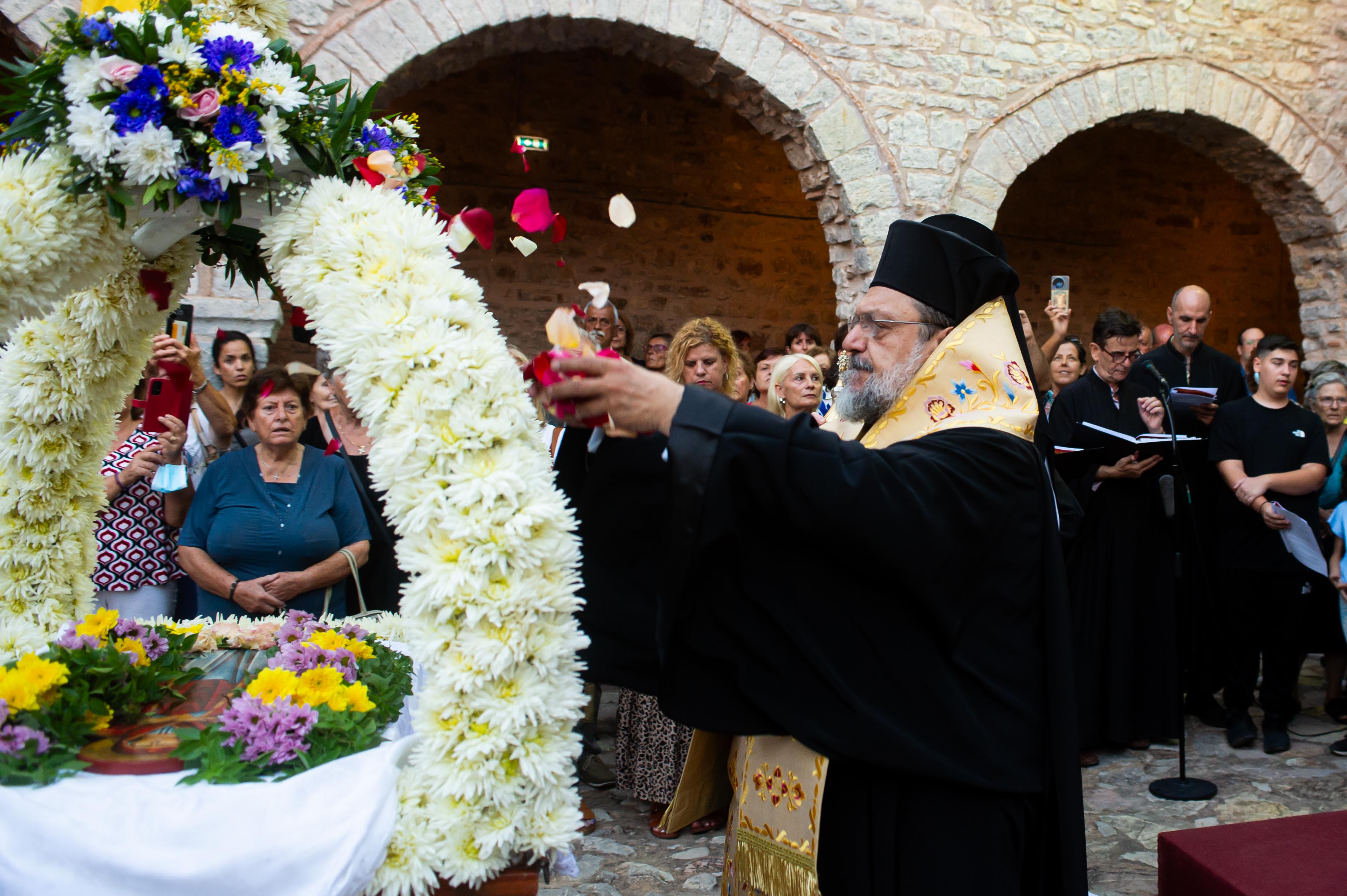 Πριν το τέλος του εσπερινού τελέσθηκε η λιτάνευση του Επιταφίου και εψάλησαν τα Εγκώμια της Θεοτόκου και εν συνεχεία η Αρτοκλασία στον αύλειο χώρο της Μονής.