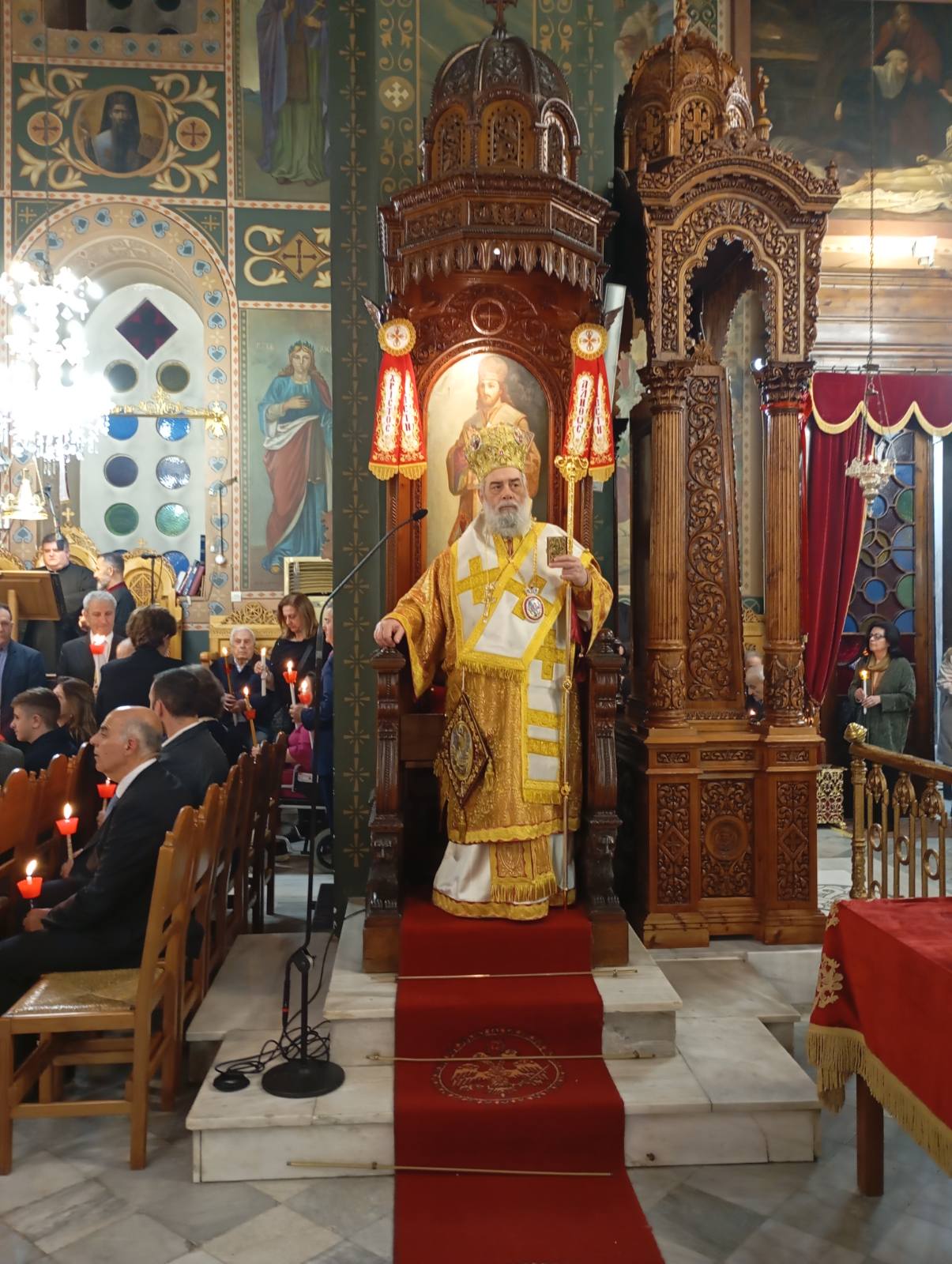 Στον Ιερό Μητροπολιτικό Ναό της Υπαπαντής του Χριστού Καλαμάτας προέστη της Ακολουθίας ο Μητροπολίτης Μεσσηνίας Χρυσόστομος, πλαισιωμένος από τους εφημερίους του Μητροπολιτικού Ναού, ενώ παρέστησαν, ο πρώην Πρόεδρος της Δημοκρατίας Προκόπης Παυλόπουλος, ο υφυπουργός Προστασίας του Πολίτη Γιάννης Λαμπρόπουλος, ο περιφερειάρχης Πελοποννήσου Δημήτρης Πτωχός, ο δήμαρχος Καλαμάτας Θανάσης Βασιλόπουλος, ο Διοικητής Φρουράς Καλαμάτας Συνταγματάρχης Γεώργιος Χαρίτος και λοιποί εκπρόσωποι στρατιωτικών, πολιτικών κ.α. Αρχών της πόλης.